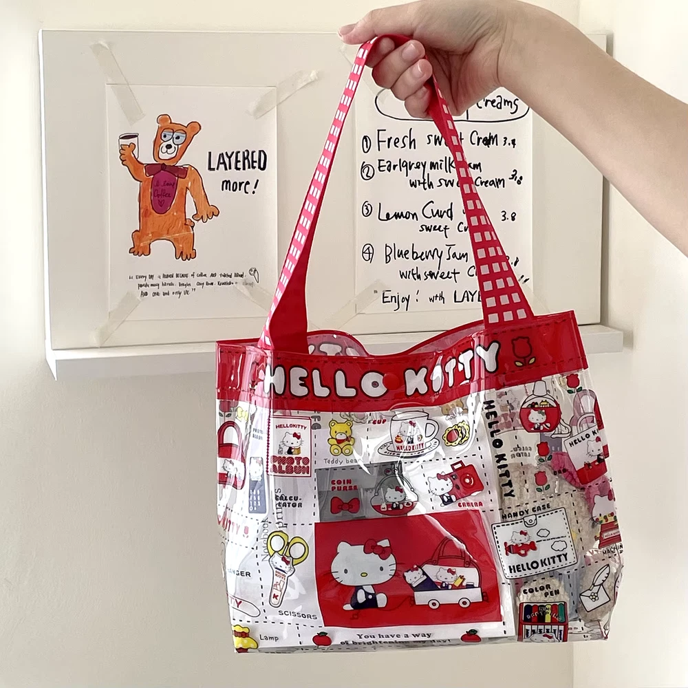 Cute PVC handbag with a Hello Kitty design in vibrant red. Features a spacious transparent compartment, ideal for makeup, storage, or travel essentials. Portable and stylish for everyday use. delivered within 2 weeks