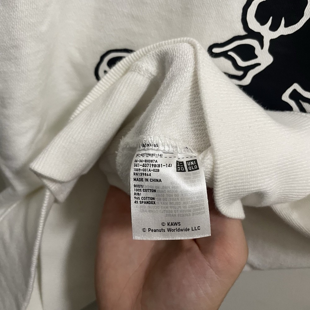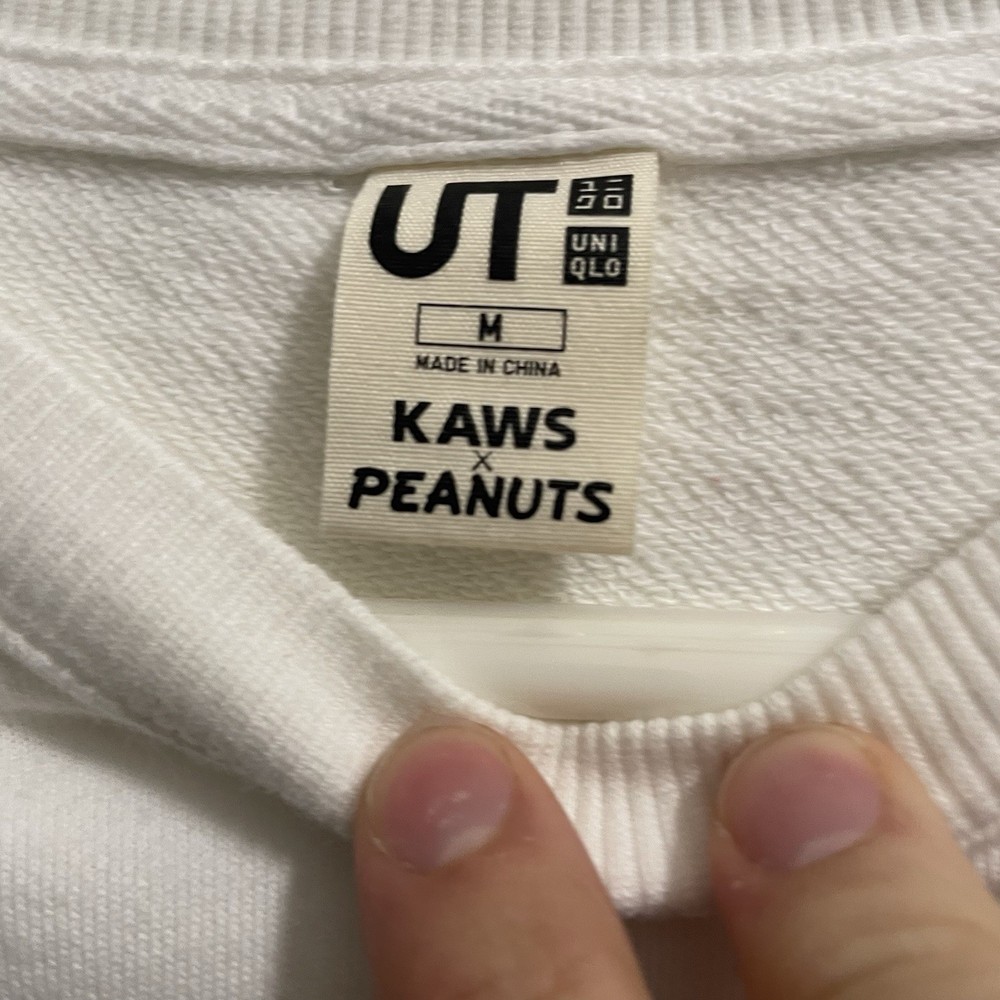 The Kaws x Uniqlo x Peanuts Snoopy Skateboarding Sweatshirt in White, size Medium, is a stylish and comfortable pullover sweater perfect for men who love cartoon characters. Made of cotton, this sweatshirt features long sleeves and a regular fit, making it a versatile piece for everyday wear. The collaboration with Kaws and Uniqlo adds a unique touch, while the Peanuts theme adds a playful and nostalgic element. Ideal for skateboarding enthusiasts, this sweatshirt is a must-have addition to any wardrobe.