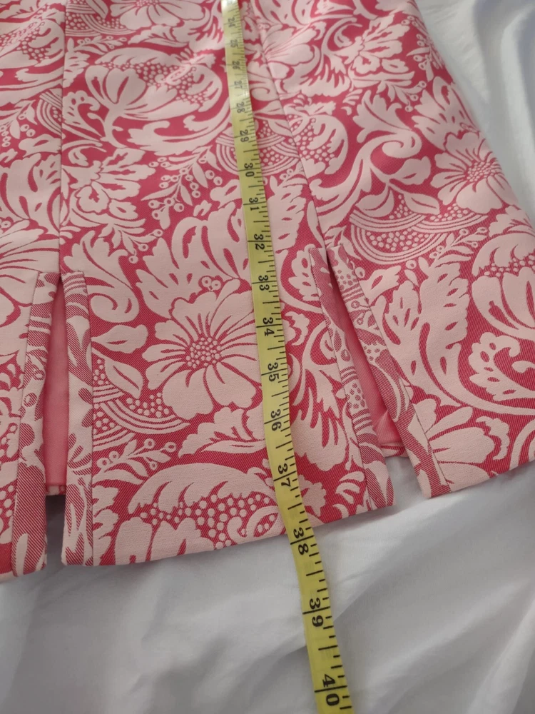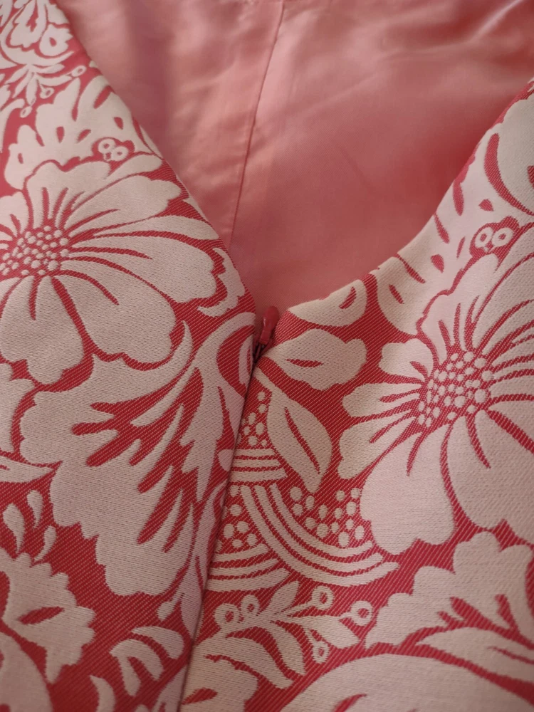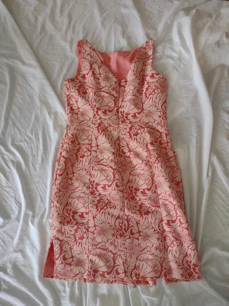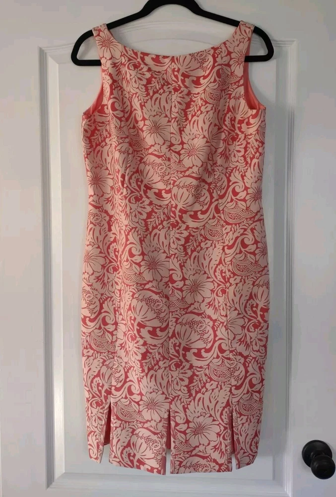 Kay Unger Dress Womens Size 8 Sleeveless Brocade Pink Sheath Knee Length Zip closure in the back Scalloped fun hem Fully lined Measurements in pics are pit to pit and full length Excellent pre-owned condition