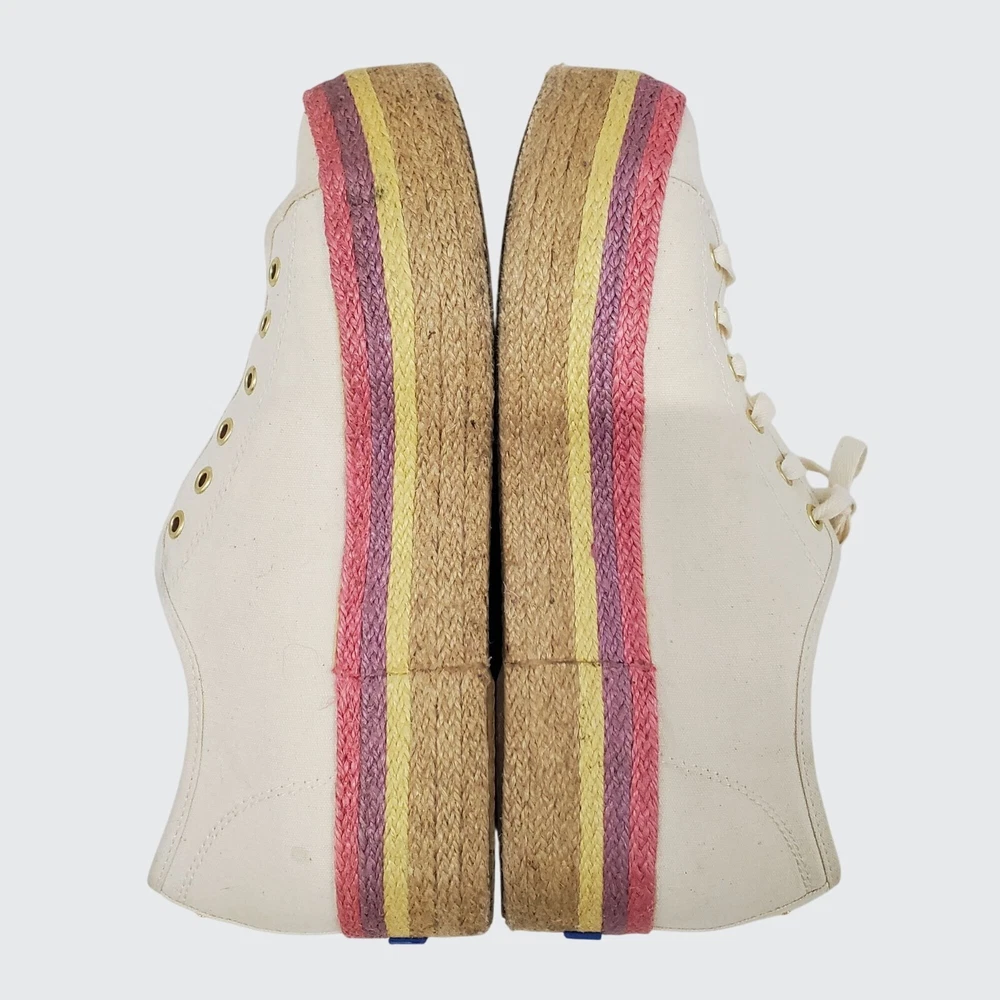The Keds Kate Spades New York Neon Raffia Platform Sneaker in a women's size 10 features a unique designer collaboration between Keds and Kate Spade New York. This sneaker is characterized by its pink canvas upper material with a neon raffia platform sole, offering a colorful and stylish look. The sneaker is designed for comfort, featuring cushioning and breathability, making it an attractive and practical choice for those looking for a fashionable athletic shoe. #keds #kedskatespade #katespade #colorfulkeds