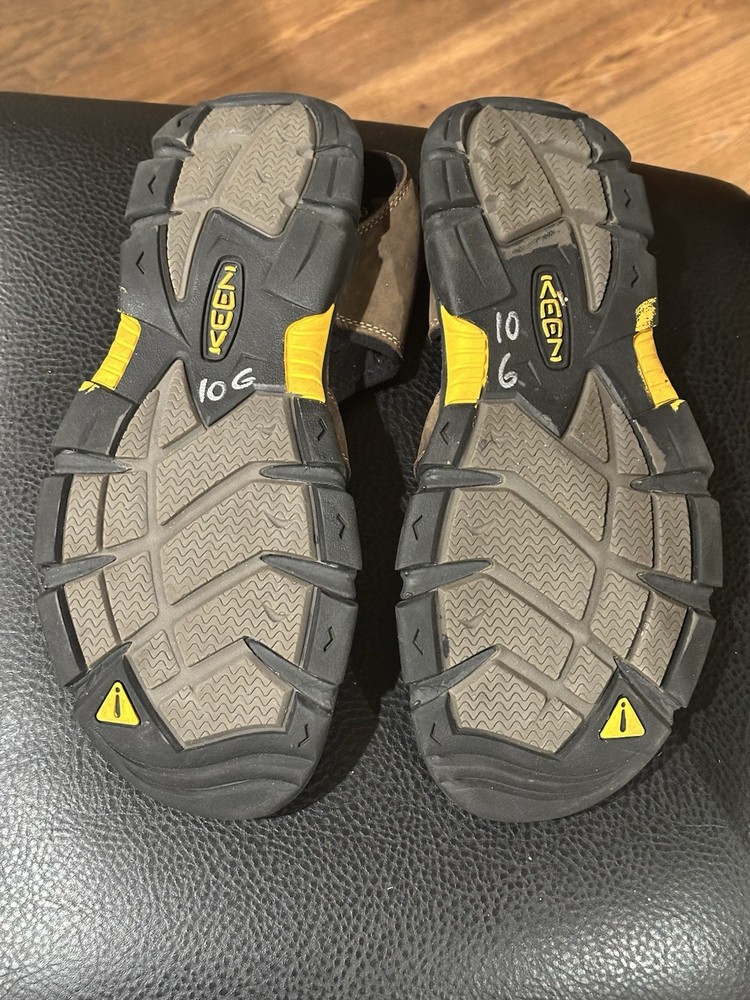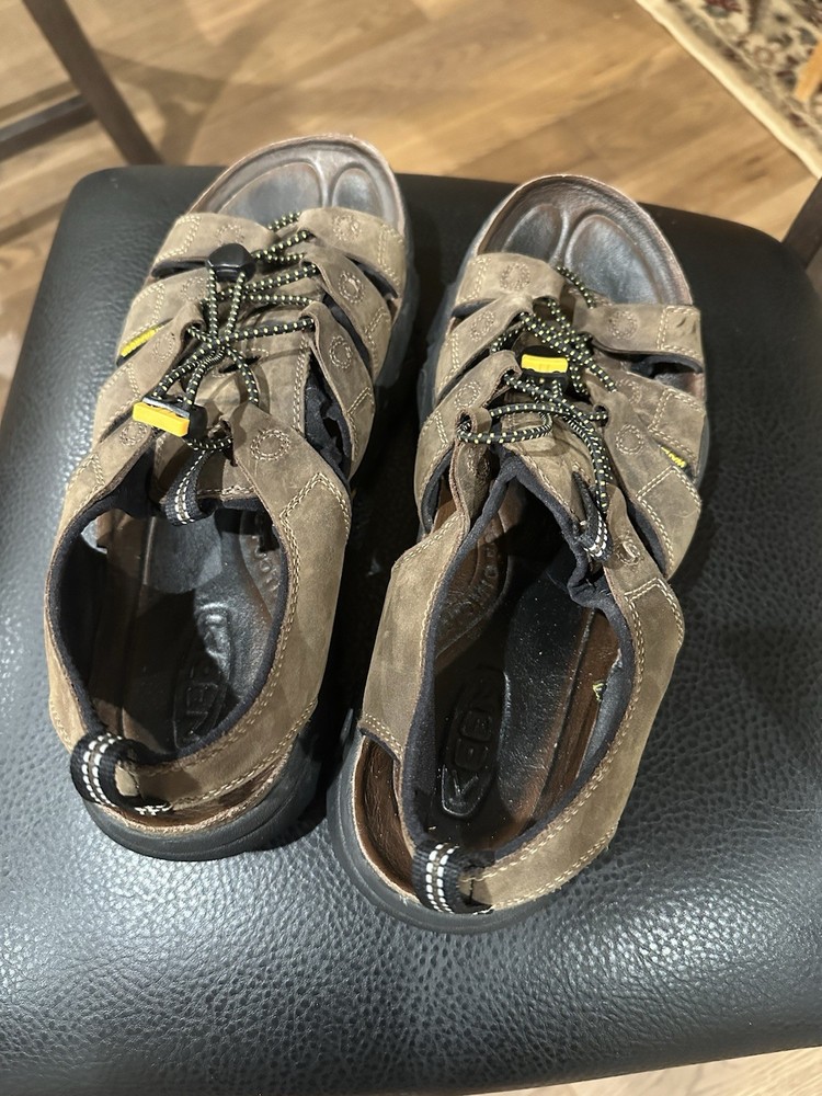 These Keen sandals are a summer must-have! The brown leather looks stylish yet rugged, and the breathable fabric lining keeps my feet cool all day. The adjustable drawstring lets me customize the fit, and the sturdy sole gives great support for walking. They’re perfect for hikes, beach trips, or just casual outings—super versatile and built to last. Love the open toe for breathability, and they still feel supportive. The gently worn look adds character, and they’re just as comfy as new. Highly recommend for anyone wanting durable, good-looking sandals!