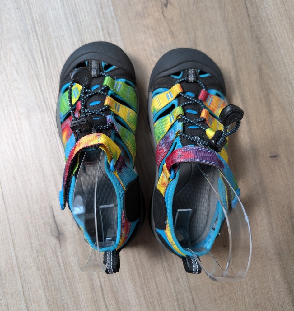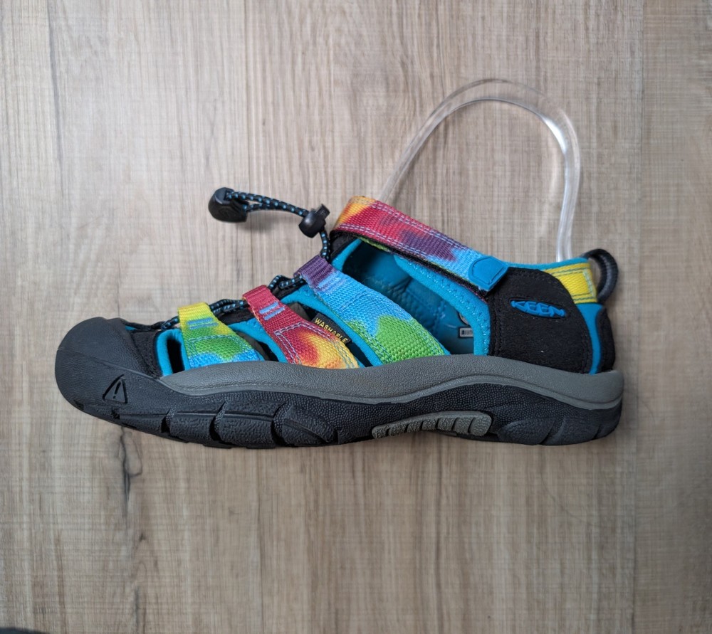 Used in great condition. Please see pictures for details. The Keen Newport H2 Big Kids Tie Dye Sandals are colorful water shoes designed for beach and water sports activities. With a durable rubber outsole and polyester upper material, these sandals feature a convenient hook & loop closure for easy on and off. The vibrant rainbow tie dye pattern adds a fun and stylish touch to these water shoes, making them perfect for both boys and girls. Made by the trusted brand KEEN, these sandals are a reliable and fashionable choice for any outdoor adventure.