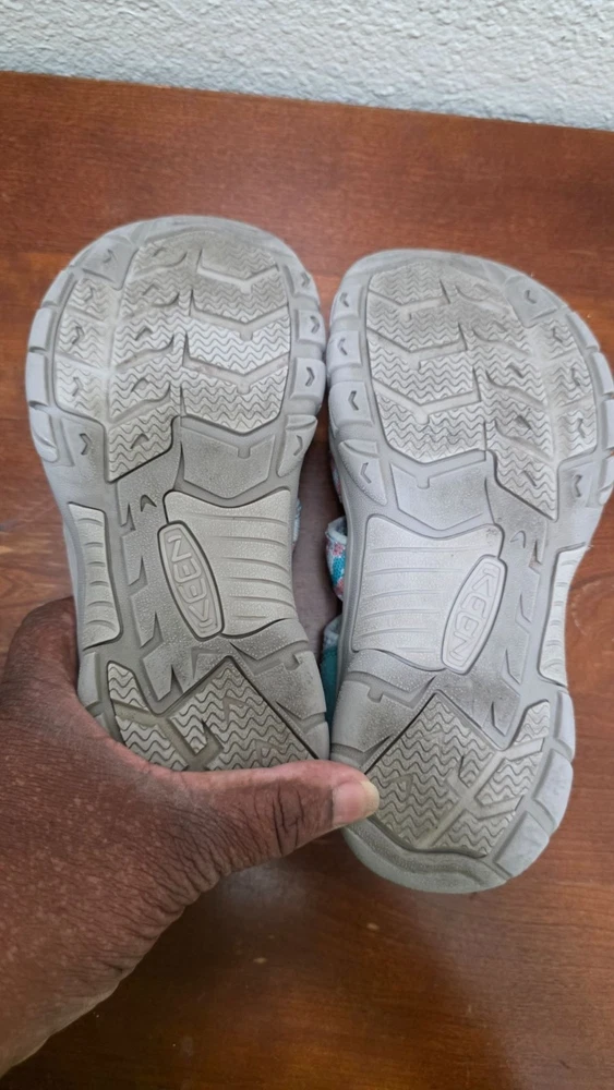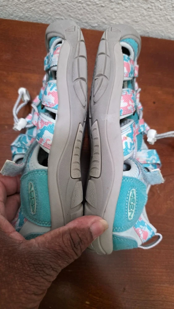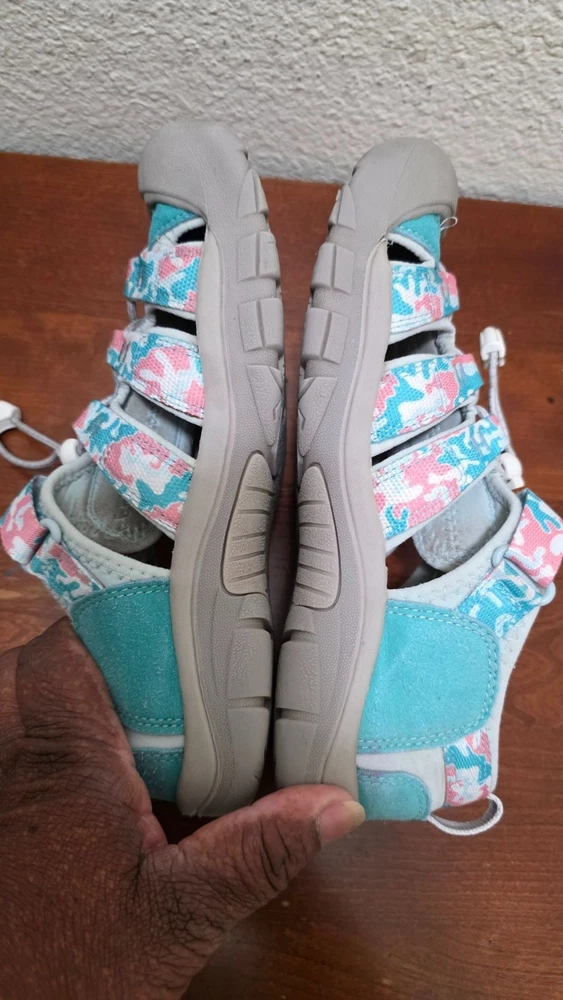 Durable and stylish, these Keen Newport H2 sandals feature a vibrant teal and pink camo design. Ideal for kids' outdoor activities with secure fit and comfort. • Adjustable hook-and-loop strap for a secure fit • Non-marking rubber outsole for enhanced grip • Washable polyester webbing • Quick-dry lining for active use • Pull-on secure lace system CONDITIONS pre owned, Slight wear on soles and straps, good conditions. see photos for more details.