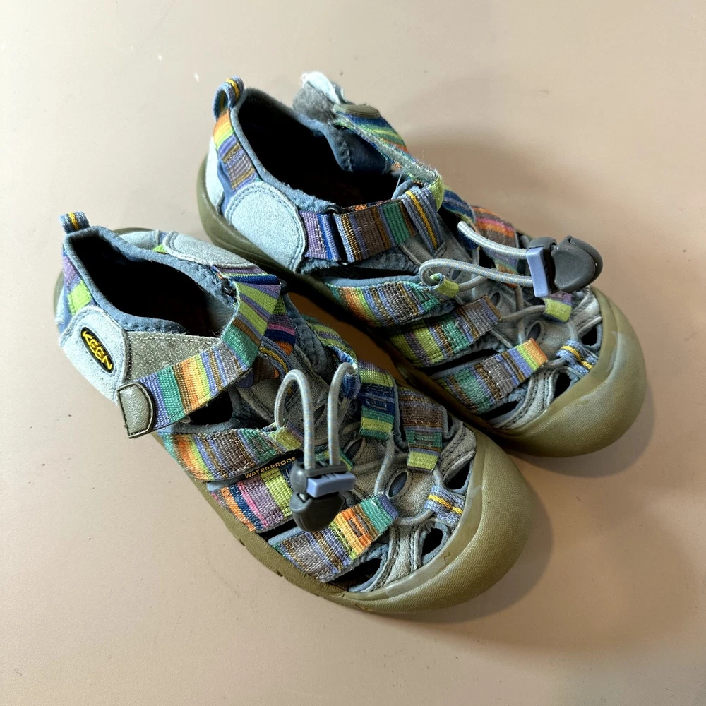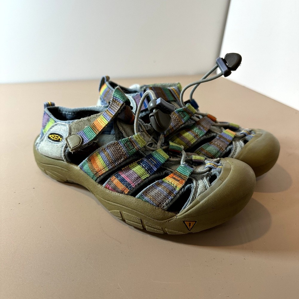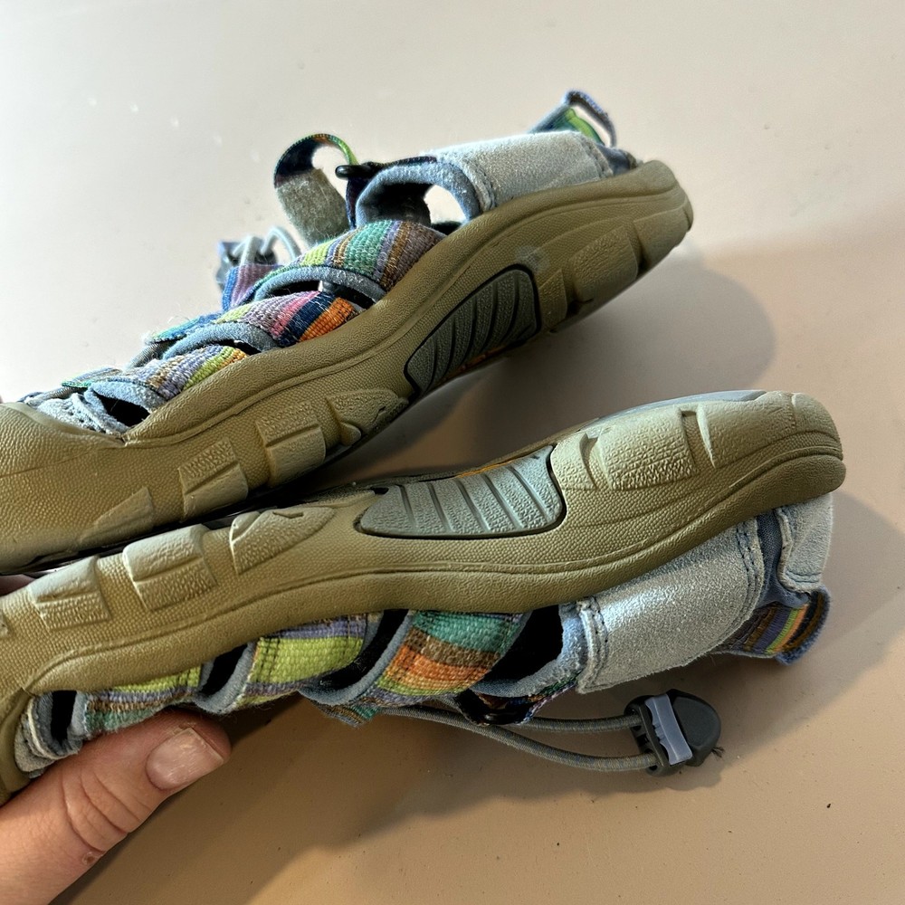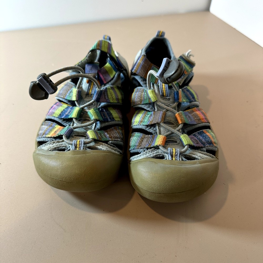 Keen Newport H2 Stripe Rainbow Sandal Girls Youth Big Kid 3 Outdoor Water Hiking Active Very pretty!! In great shape but one of the side patches that says "keen" has come unstitched, you could glue it back down. See closeup photo. Size 3, fit us around age 8-10, your mileage may vary.