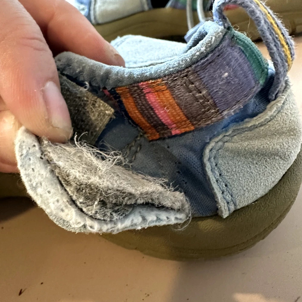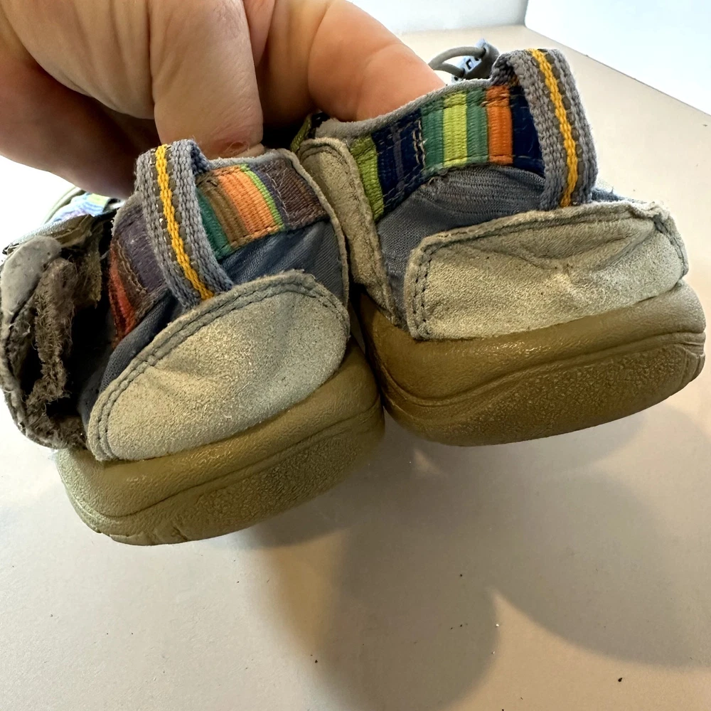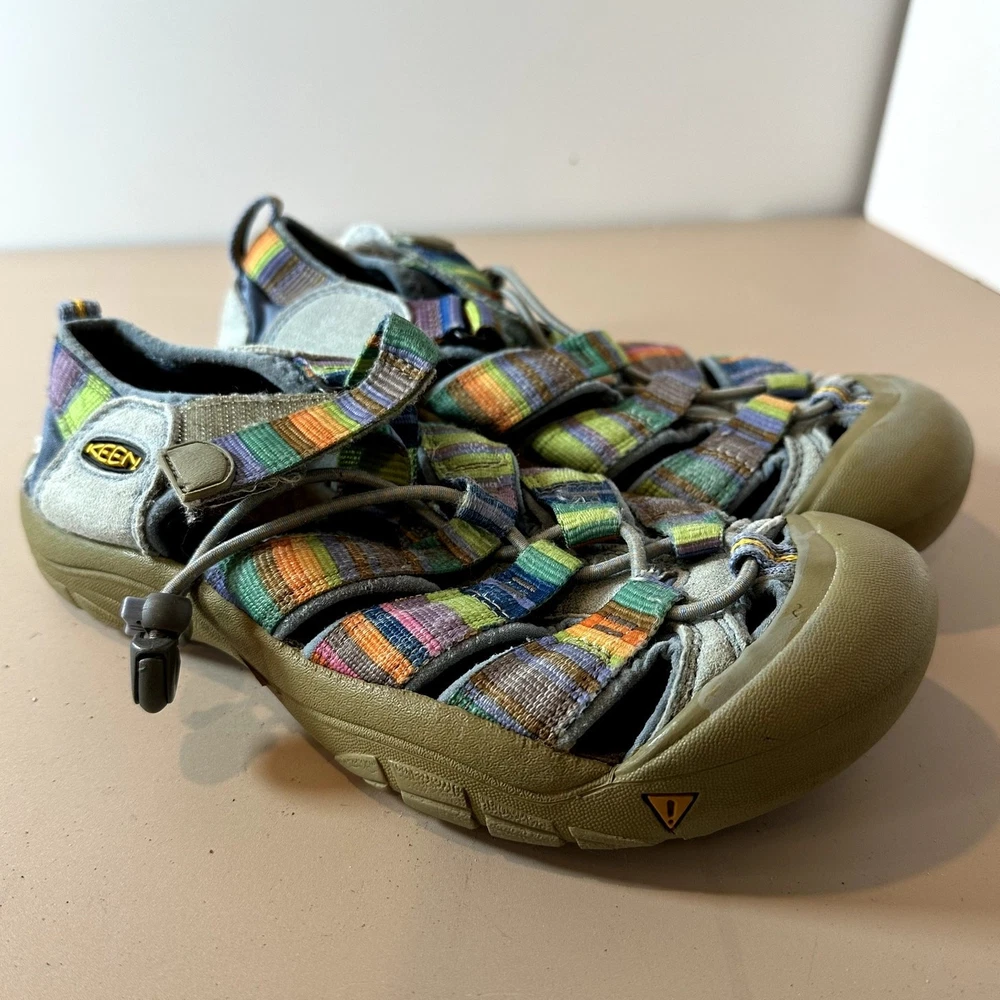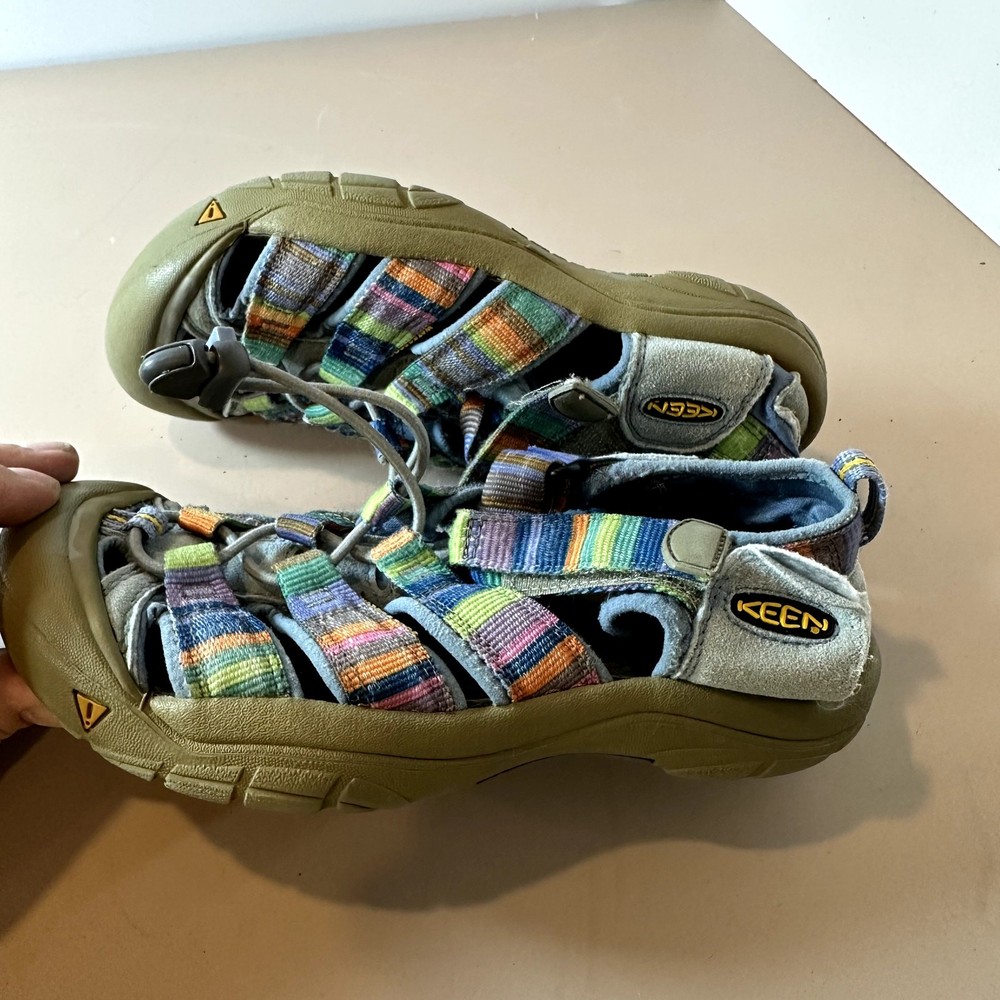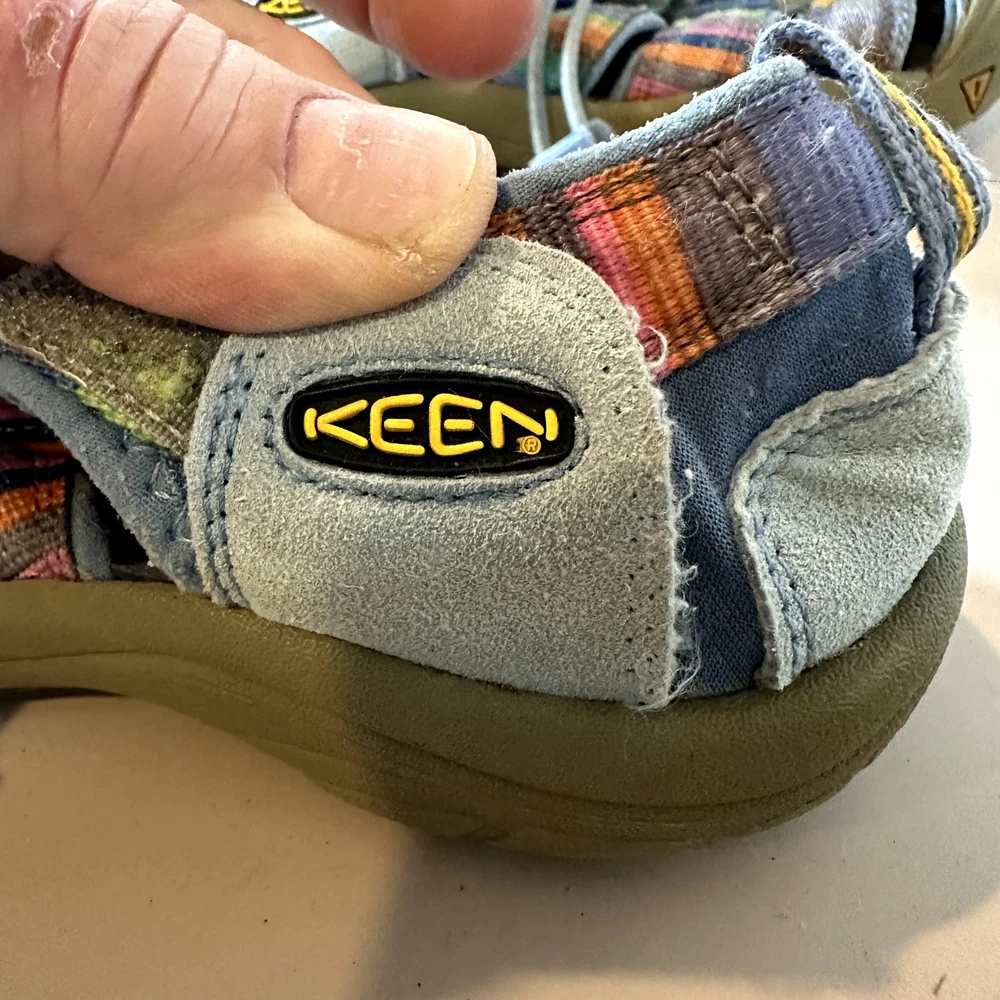 Keen Newport H2 Stripe Rainbow Sandal Girls Youth Big Kid 3 Outdoor Water Hiking Active Very pretty!! In great shape but one of the side patches that says "keen" has come unstitched, you could glue it back down. See closeup photo. Size 3, fit us around age 8-10, your mileage may vary.