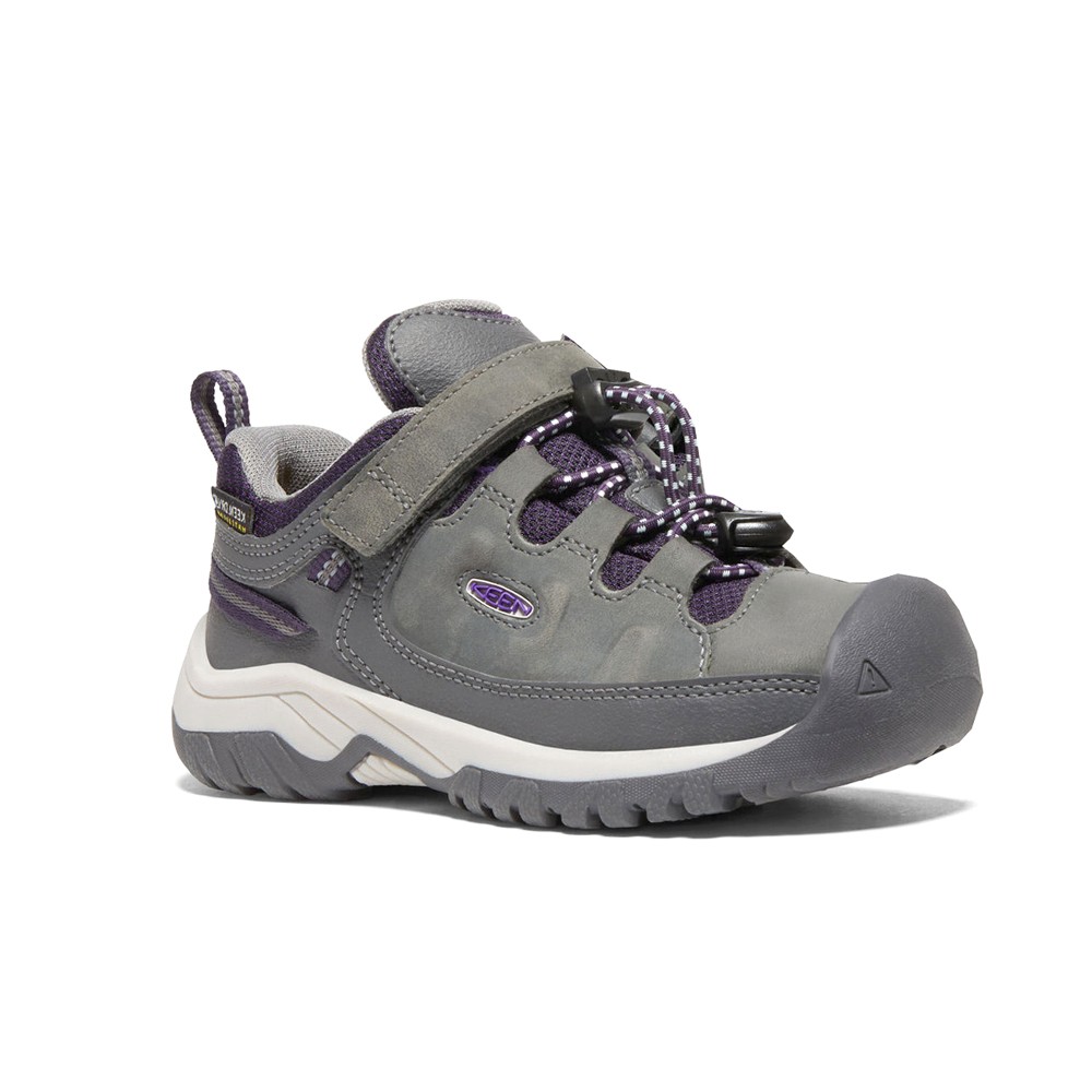 Targhee Low Waterproof Hiking Shoes (Little Kid) Product Details Leather upper Lace lock bungee system Breathable mesh lining Non marking KEEN.FUSION rubber outsole When kids are outside, the whole world is wide open. There are trails to explore, rocks to climb, and structures to play on. Keen's kids' original hybrid hiking trainer is designed for the trail but ready to give kids rugged protection and room for your toes comfort wherever the fun takes them. Additional Details Color: Grey Occasion: Casual Gender: Boys Age: Youth Brand: Keen