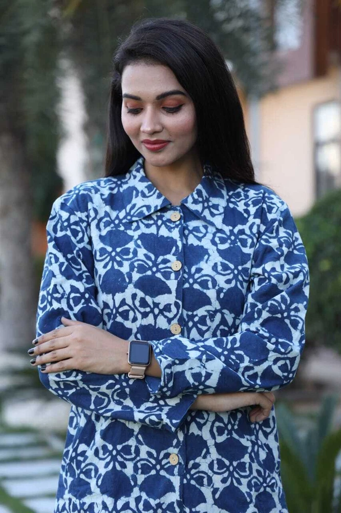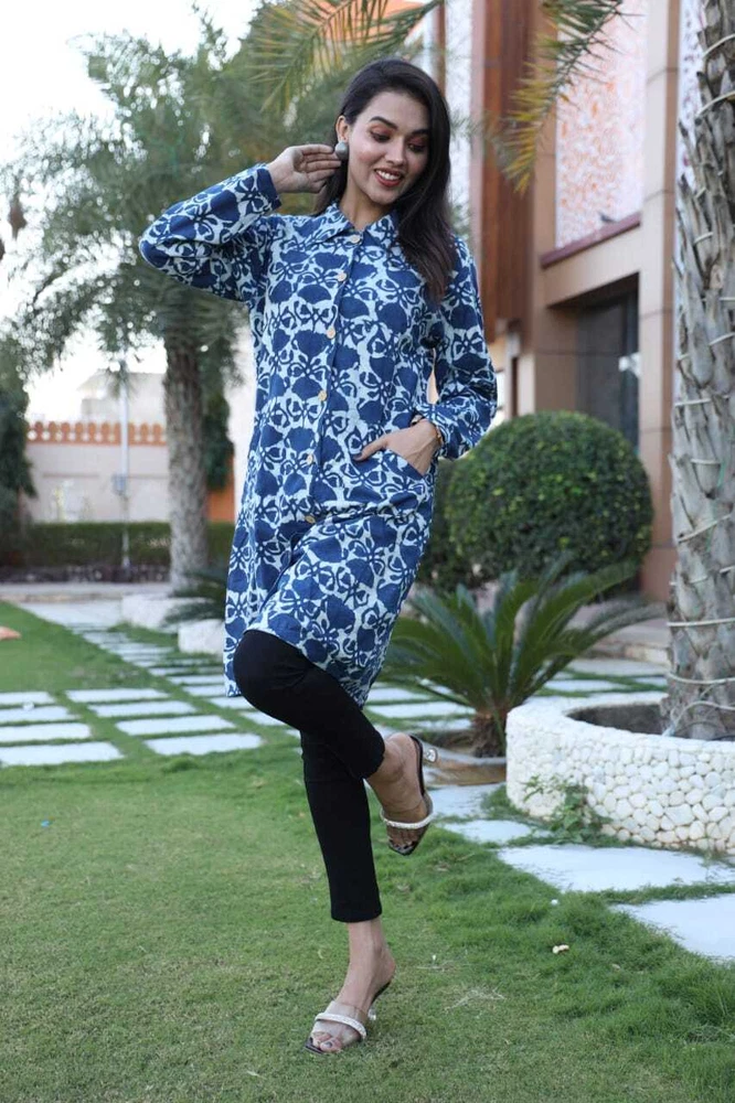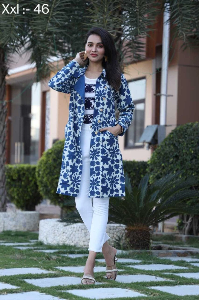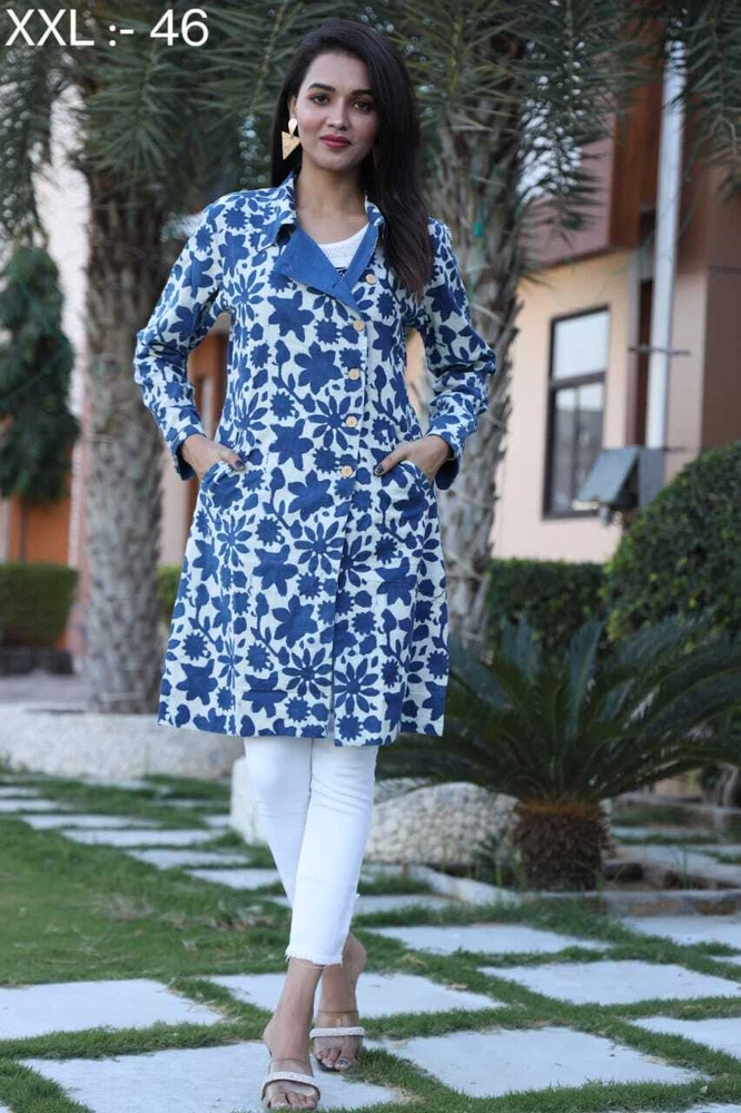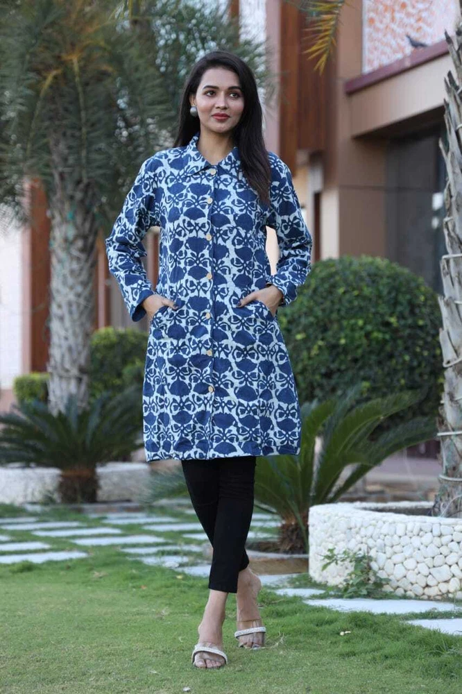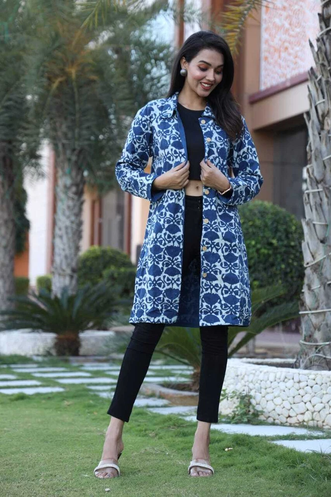 Keep Warm and Stylish: The Ultimate Long Winter Jackets for Women/Ladies/Girls- 2 Layer with Two Pockets in Beautiful Colour's Elevate your winter wardrobe with this stunning handmade reversible jackets for women's & Girls. The outer shell is made of soft cotton in a beautiful blue stripe/floral pattern, while the lining is crafted from hand printed cotton, adding a unique touch to this piece. The long coat length and long sleeves of Women jackets provides warmth during the colder months, making it perfect for any occasion, from casual to formal. This quilted jacket features a button closure and pockets, and is made with 3 layers of lightweight organic cotton, providing insulation without adding unnecessary bulk. The jacket is perfect for all seasons, and its versatility is emphasized by the fact that it can be personalized, making it even more special. Made in India, this jacket is perfect for those who value art and culture, and its theme options, including festive season and hippie, make it a great addition to any wardrobe. Fabric Cotton 60×60 cambric ( Super Quality)\ Inner Side Fabric - Cotton Flex. Measurements ladies Jacket Size Bust Size ( S) - 38 Size (M) - 40 Size (L) - 42 Size (XL) - 44 Size (XXL) - 46 Note- All above Sizes of *Brust. Jacket Length- 36-37 All Sizes in *Inches.