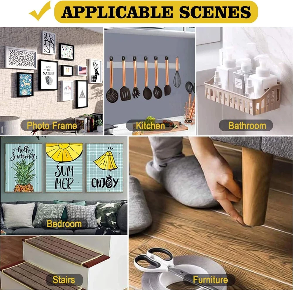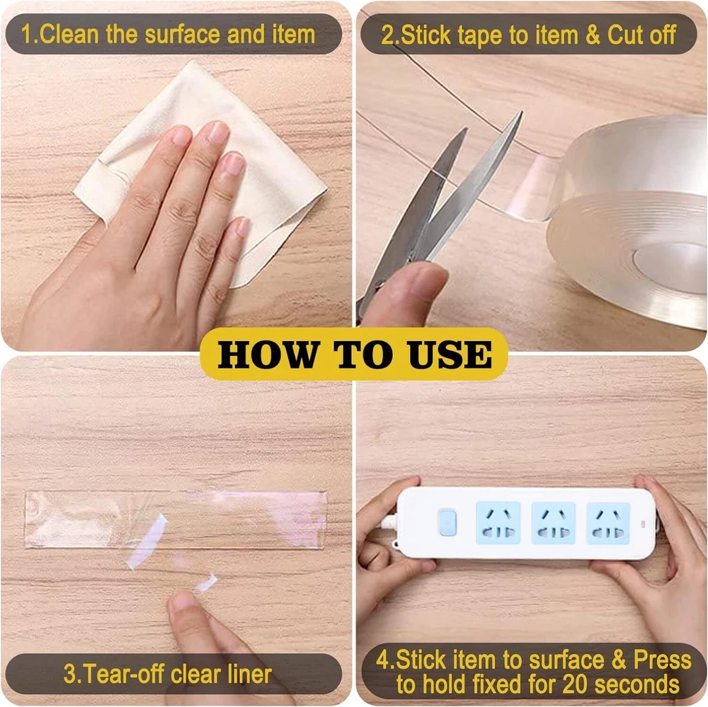Upgraded materials & sizesThe nano adhesive tape is made of acrylic-gel material and upgraded nano technology.► Length: 120 inch► Width: 1.2 inch► Thickness: 0.07 inch► Color: Transparent► Weight: 197 g/0.43 lbKey Features✔ Very strong, high tensile strength, hold up to 18 pounds✔ Washable, reusable, safe ✔ Easy to cut, remove and NO residue✔ Multipurpose,stick to almost any smooth surfaceHow to UseStep 1: Clean the surface you want to stickStep2: Cut it to the size you want and stick it on surfaceStep3: Peel off the clear plastic film before usingCut,Peel,Stick,and you're DONE! You'll love this stuff!KINDLY NOTE♥1. Please DO NOT use on powder walls, painted walls,broken walls,wet walls,greasy surfaces or rough surfaces.2. Clean the surface to make it smooth and dry before using.3. Align object to tape and press firmly for 60 seconds.4. Dry the two sided tape with a dryer after washing. Do not wipe with a rag or paper.5. If you need to remove adhesive strips after sticking it, you can slowly and gently remove the doubles sided adhesive with a hair dryer.6. To avoid damage, please do not paste Very heavy and expensive items. 【Double Sided Tape】Made from the latest acrylic-gel material, our transparent adhesive tapes are very strong sticky.size:length 120in, width 1.18in, thickness 0.07in, Strong Holding Power:Holds up to 18 pounds on smooth surfaces (1 pound per 4 inches). 【Removable & Reusable & Traceless Tape】This kind of double sided tape is easy to tear off from smoothy surface without damages.If the tape gets dirty and you want to reuse it,you can clean it with water and make it dry to restore its high stickiness. 【Easy To Use】Using our double stick tape heavy duty mounting is very easy:1.Keep liner on tape &Cut to any size 2.Place tape on area and remove liner 3.Align object to tape and press firmly for 60 seconds. DIY this transparent adhesive tape to any size to meet your needs! It can be stretched, bending and folded out of shape. Use more nano tape to keep them stronger if the object is heavier. 【Wide Application】This double sided tape will stick to almost anything with a smooth surface so you can stick anything anywhere, such as fix the carpet or paste picture frame, poster, wall sticker, wall decor, etc. The heavy duty tape is versatile and able to bring great convenience to your life, ideal for kitchen, living room, office, etc. This super adhesive tape works normally in temperatures range from 0℉ to 200℉. 【Double-Sided Tape Makes Life Easier】Double Sided Wall Tape is a Must-Have in Your Household.It can replace many tools to achieve the purpose of paste, greatly improve the convenience of operation.Get one for your household and stick items easily without damaging them.