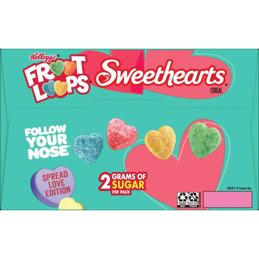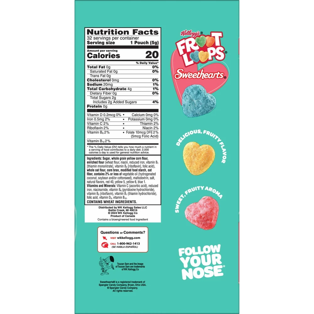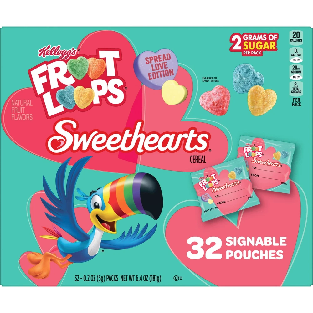 Follow your nose to delicious bursts of fruity flavor in Kellogg's Froot Loops Sweethearts cereal snacks. Perfectly sweet for Valentine's Day snacking, dig into vibrant crunchy heart-shaped pieces everyone will enjoy. It's like a heart-shaped rainbow in every pouch. Fun to eat for adults and kids, these healthy cereal snacks come in signable pouches that make classroom sharing easy; The entire family can enjoy as a quick morning snack, afternoon pick-me-up or as a late-night treat. These delicious crunchy Froot Loop snacks are perfect for Valentine's Day festivities, Valentine's Day classroom parties, Galentine's Day, or for simply celebrating the holiday. Always have these sweet cereal snacks handy, add fruity goodness to any lunch box, tote bag, or backpack. Any time you want an instant flavorful pick-me-up in your day, reach for a pouch of Kellogg's Froot Loops Sweethearts Spread Love Edition cereal snacks. Enjoy the sweetest time of year with cereal snacks bursting with fruity flavor in cute Sweethearts shapes perfect for Valentine's Day parties Froot Loops Sweethearts Spread Love Edition feature heart-shaped pieces with fruity flavors; Share Valentine's Day Froot Loops pouches with loved ones Healthy, delicious cereal snacks; Kosher Dairy; Contains wheat ingredients Pack in bags for Valentine's Day classroom parties and holiday festivities with friends and family; Signable pouches make classroom sharing easy Includes 1, 6.4oz cardboard box containing 32 pouches of Kellogg's Froot Loops Sweethearts cereal snacks; Packaged for instant freshness and great taste