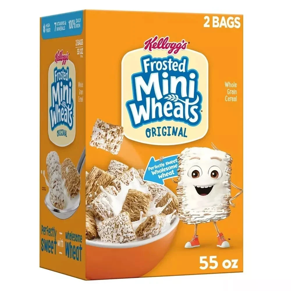Kellogg's Frosted Mini-Wheats Breakfast Cereal, 55 oz. Description : Wholesome and Nutritious Breakfast Option Start your day with Kellogg's Original Frosted Mini-Wheats, a wholesome and low-fat breakfast cereal designed to fuel your big day. These bite-sized biscuits offer a hearty crunch with crispy layers of wheat made from 100% whole grain, topped with irresistible sweetness in every bite. Rich in Whole Grain and Fiber With 48 grams of whole grain per 60-gram serving, these tasty squares are not just delicious but also an excellent source of fiber. Each serving is packed with beneficial nutrients, making this cereal a satisfying and nutritious choice. Fortified with Vitamins and Minerals Each satisfying serving of Kellogg's Frosted Mini-Wheats contains a good source of 7 vitamins and minerals. This helps provide the necessary fuel for whatever lies ahead, making it a great choice for breakfast or any time of the day. Features : Includes two 22.5 ounce bags of delicious Frosted Mini-Wheats cereal packed into a 55-ounce box; Convenient, ready-to-eat cereal packaged for freshness and great taste Crunchy, bite-sized wheat biscuits with the irresistible taste of sweet frosting in every satisfying spoonful Start your day off right with the fortifying goodness of wheat biscuits made with 100% whole grain and delicious frosting A low fat, healthy cereal that's sure to please both kids and adults; Enjoy with or without your favorite milk; Makes a tasty snack at work, school, or as a late-night treat With 48 grams of whole grain per 60 gram serving; Good source of 7 vitamins and minerals per serving; No artificial flavors or colors; No high fructose corn syrup We try our very best to make sure every customer is completely satisfied. If there's a problem, message us! We're happy to help Visit Our store to get great Discounts ,looking forward for your positive response !