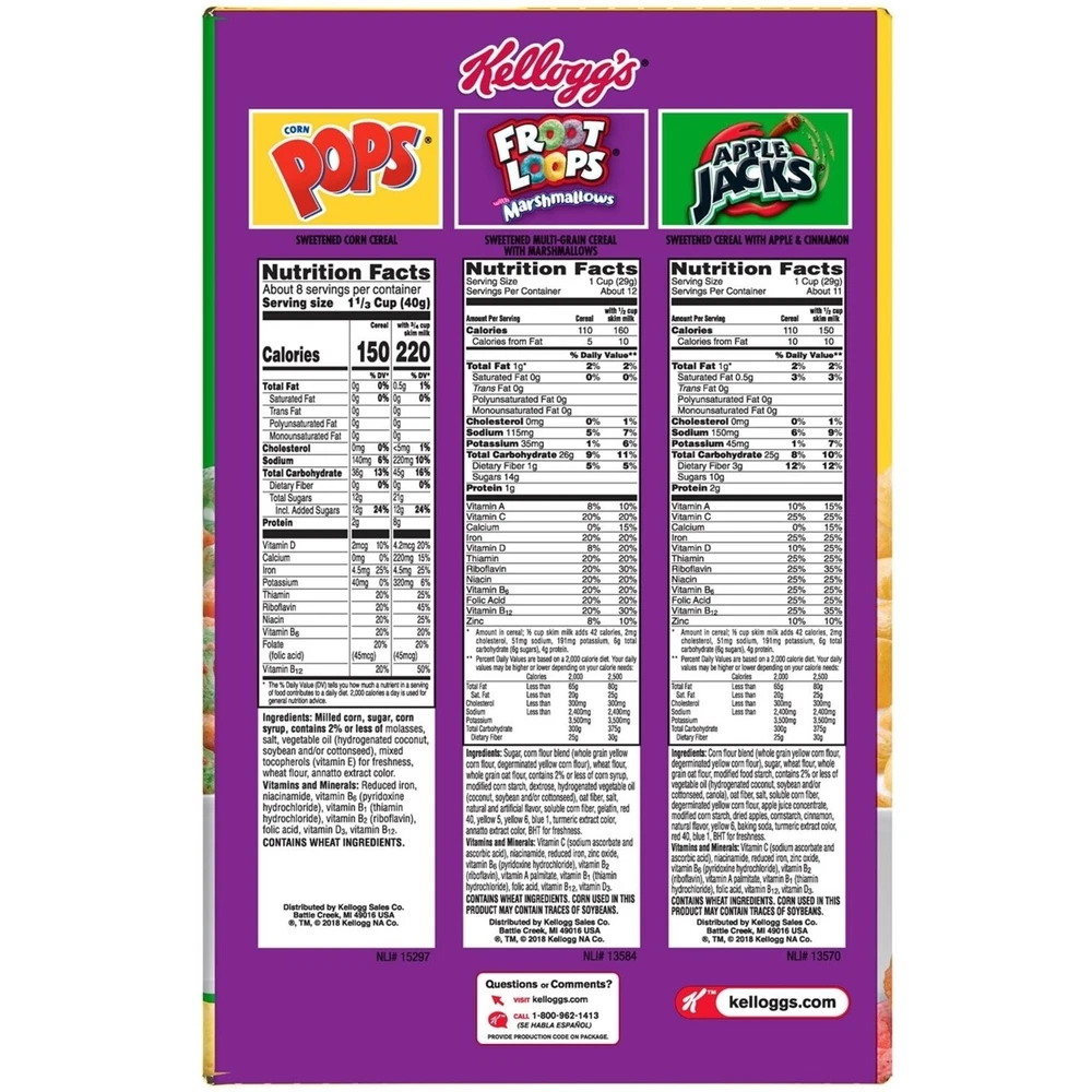 One variety pack that is Great for the whole household. Enjoy all your favorite cereal varieties. Kelloggs Kids Variety Pack (37.3 Ounce) One variety pack that is Great for the whole household. Enjoy all your favorite cereal varieties. Product Attributes: Ship From Zip Code : 78620 Weight (lbs.) : 9.50 lb Length (in.) : 10 Width (in.) : 8 Height (in.) : 14 UPC: 038000191077 Brand: Kellogg
