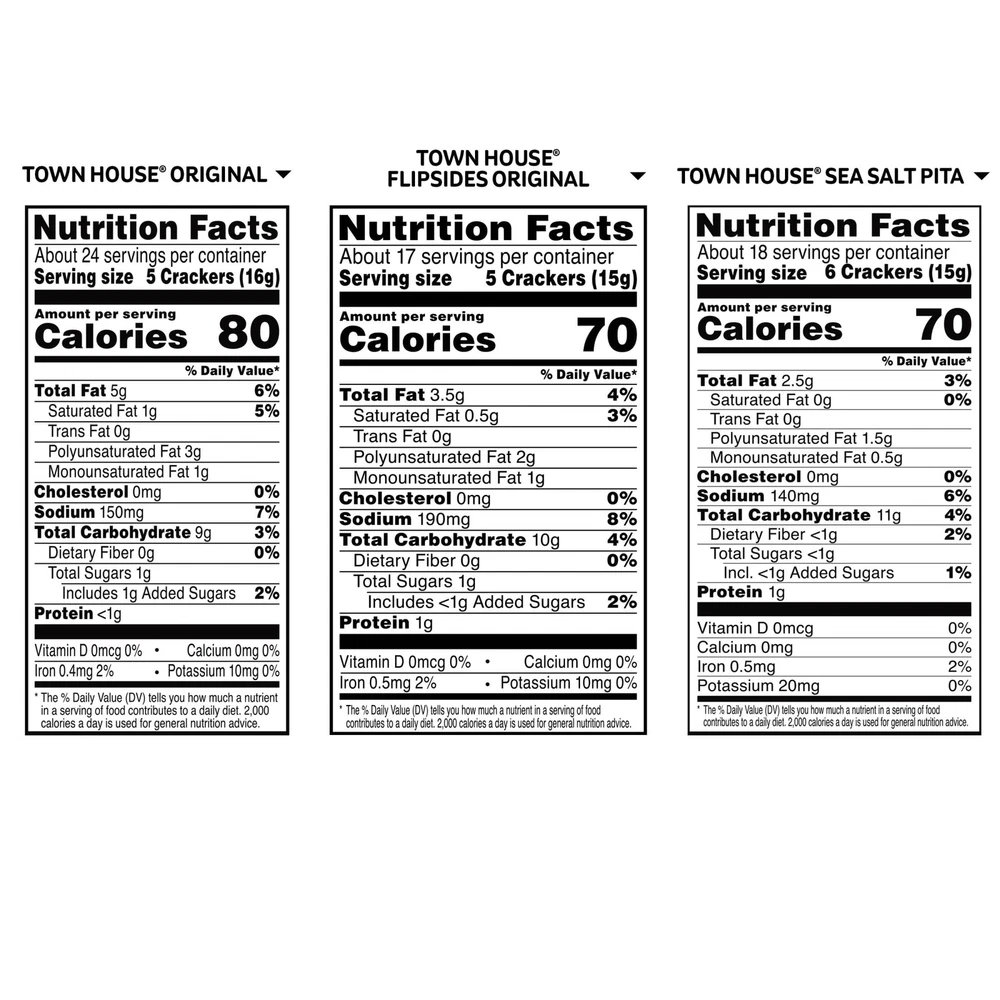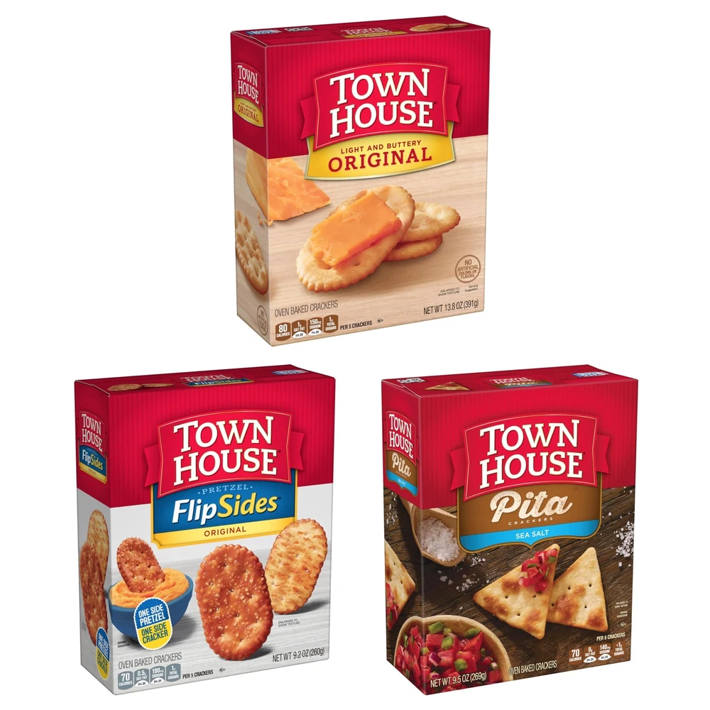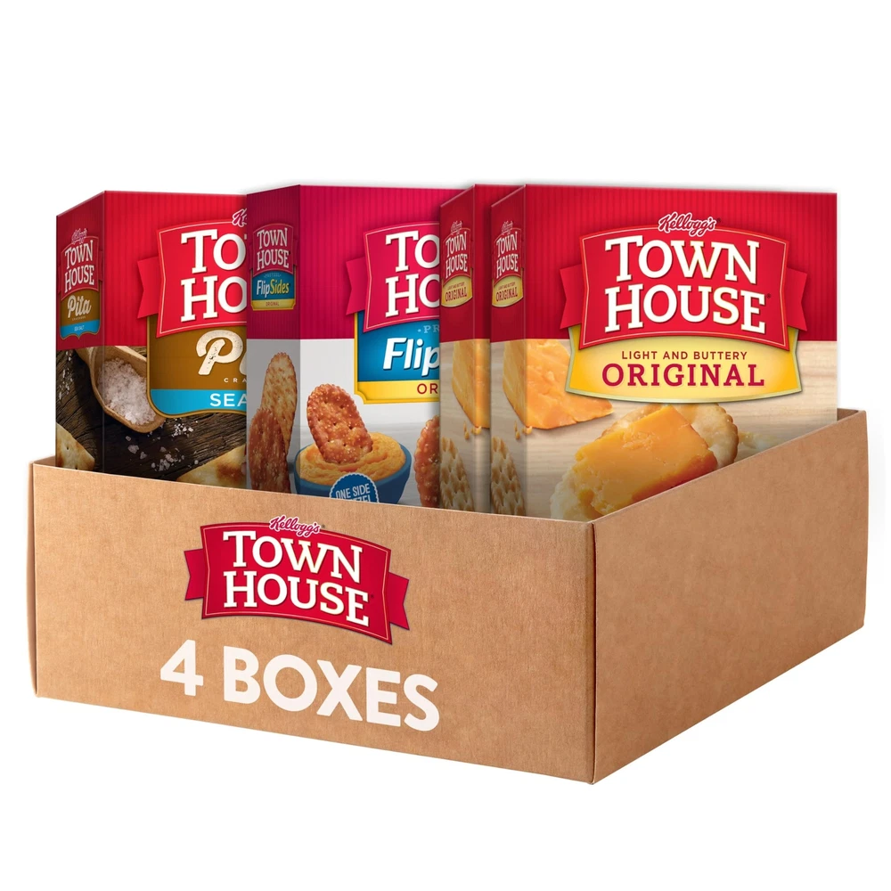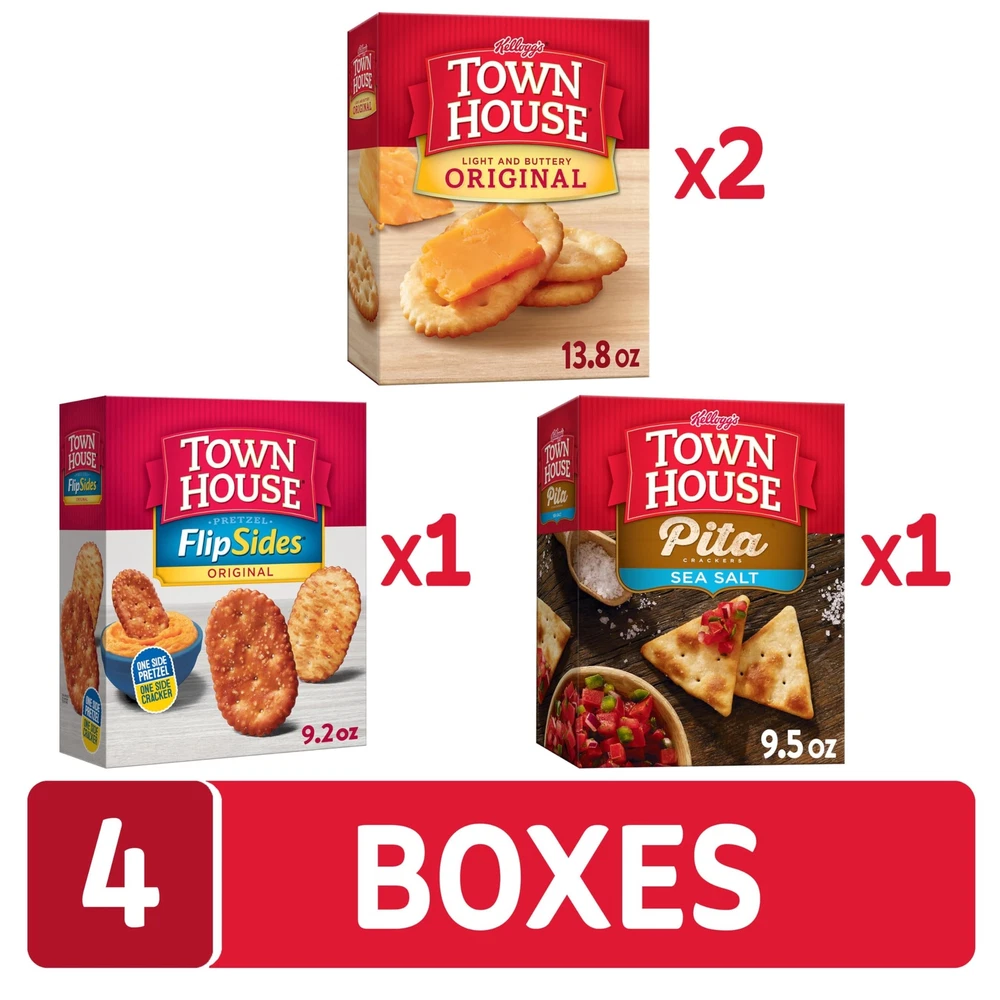 Kellogg's Town House Crackers, Party Snacks, Party Pack, Variety Pack (4 Boxes) Description Welcome to the great-tasting way to entertain everyone's taste buds, including yours. It's the classic, inviting taste of Town House in a variety pack that features flavors to delight family, friends, and neighbors. Now you can bring crispy, crunchy, oven-baked goodness to your table in a snap. Take your pick of Town House Light and Buttery Original Crackers, Town House Sea Salt Pita Crackers inspired by oven-baked pita bread, and Town House Flip Sides Original; Pair them with favorites such as cheese spread, spinach dip, or hummus at your next party or enjoy them as a satisfying snack. Share them with the kids to create a tastefully inspired snacking experience. Heading to a get-together? Take a box along with your favorite cheeses as an exciting alternative to chips. Whether you're planning a family night, small get- together, or large gathering, serving up memorable snack times in and out of your home starts with Town House. Features: A variety pack of irresistibly crispy crackers that love to be dipped, dunked, and topped or enjoyed all on their own Every batch is made from a tried and true, oven-baked recipe Contains delicious ingredients, like whole wheat flour, that complement a variety of dips, spreads, and toppings Great for adults and kids; Stock them in your home pantry; Keep on hand for unexpected guests Includes two, 13.8oz boxes of Town House Original, one, 9.2oz box of Town House Flip Sides Original, and one, 9.6oz box of Town House Pita Sea Salt crackers Product Details: Flavor: Variety Pack Brand: Townhouse Item Weight: 2.9 Pounds Allergen Information: Wheat, Milk, Soy Package Information: Box Package Dimensions : 10.59 x 8.62 x 6.77 inches; 2.89 Pounds Manufacturer : Kellogg's Country of Origin : USA Handling We will ship all orders within 3 business days of payment. Delivery We do not ship outside of the Continental US. Feedback We take our reputation seriously, we buy and sell online, so we understand the value of trust. If you are unsatisfied with your order, please contact us and we will work with you to resolve it to your satisfaction.
