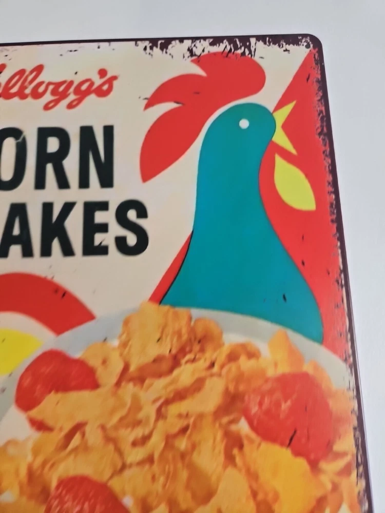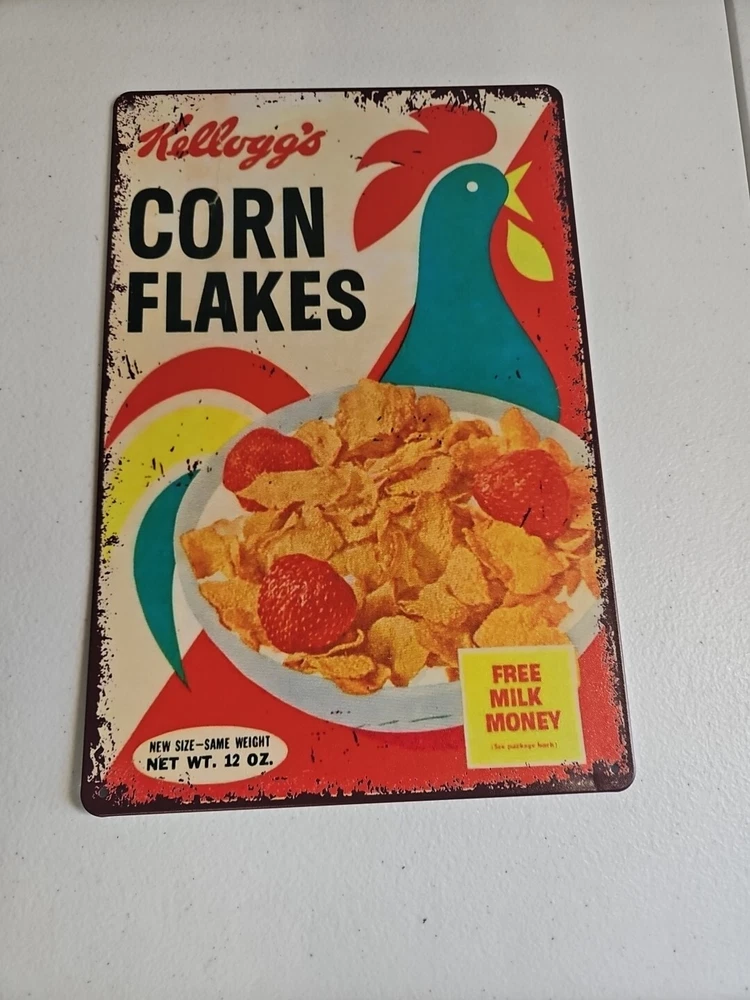 Additional Parts Required: No Mounting: Wall Mounted, Hanging, Door Mounted Brand: Unbranded Room: Any Room, Kitchen Finish: Metallic Item Width: 8 inches Style: Rustic/Primitive Color: Multicolor Features: Decorative, Indoor, Outdoor Type: Sign Shape: Rectangle Orientation: Vertical Material: Metal Item Height: 12 in Theme: Novelty Subject: kellogs