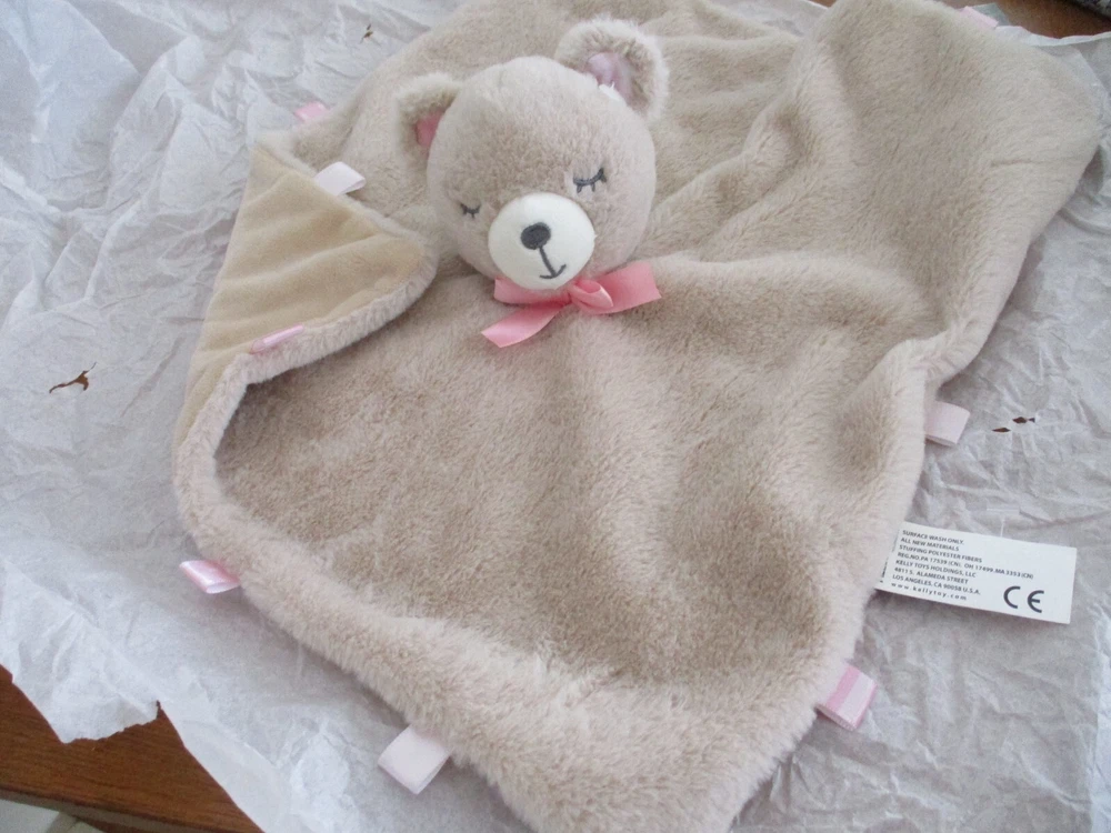 YOU ARE LOOKING AT preowned CONDITION : Kellytoy Baby Lovey Plush Tan Bear Security Blanket Pink Ribbon Rattle 14” Toy SMOKE AND PET FREE HOME.USA SHIPPING ONLY. PLEASE CONTACT ME THROUGH E-BAY ONLY. SEE MY OTHER ITEMS IN AUCTION. I AM HAPPY TO COMBINE SHIPPING. THANKS FOR LOOKING. PLEASE ASK QUESTIONS. I TRY TO DESCRIBE ACCURATELY AND WANT YOU TO BE HAPPY WITH PURCHASE SO IF ANY PROBLEMS, PLEASE CONTACT ME.