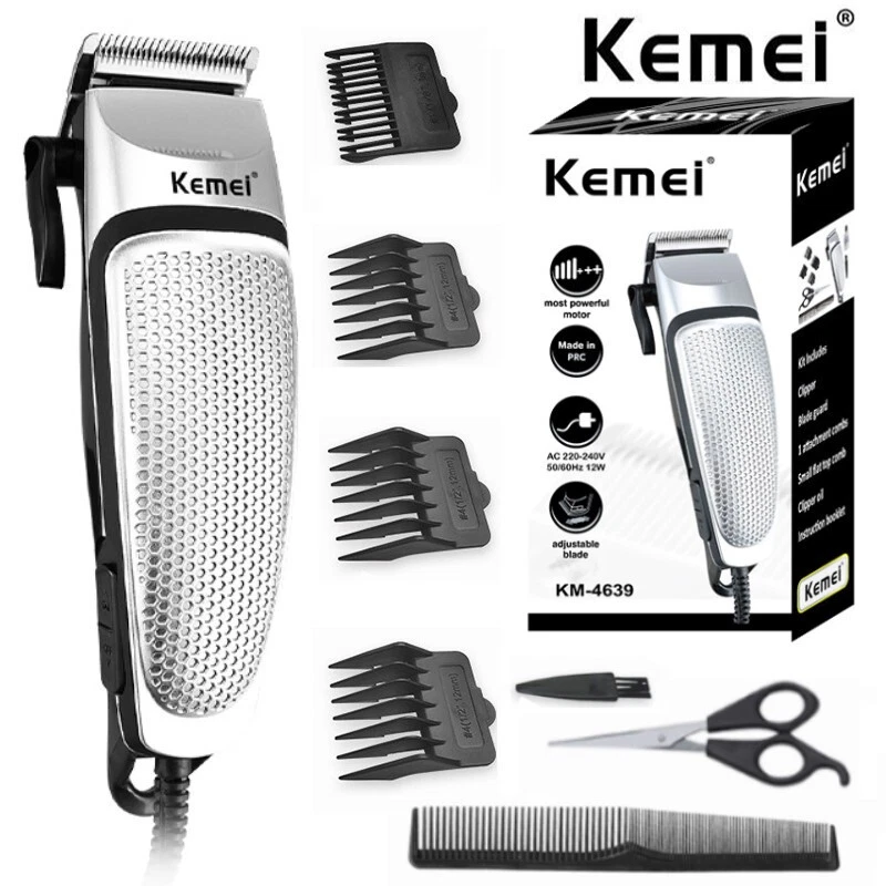 SPECIFICATIONS Brand Name : Kemei Origin : Mainland China Commodity Quality Certification : ce Hign-concerned Chemical : None Material : ABS+Metal Motor type : ROTARY Size : Original Number of nozzles : 3 - 4 pcs Length adjustment method : Change of nozzles Battery Charging Time : up to 2 hours Battery Life : over 90 minutes Item Type : hair trimmer Power type : Mains operation Function : Electric length adjustment Function : wet haircut Function : dry haircut Function : Automatic power selection based on bristle density Function : Washing knives under water Function : fast charging Function : Charging indication Maximum cutting length : 5 - 10 mm Purpose : For beard and mustache Purpose : For body Purpose : For the head Blade Material : STAINLESS STEEL Minimum cutting length : less than 0.5mm Choice : yes Specification: KM - 4639 is designed for all kinds of hairstyles and widely used, it is just for the household. The blade is high quality and durable, so it will not tangle your hair and always cut it neatly. Besides, you could choose the guide combs according to your need and will have an excellent haircut experience. Features: - The blade of carbon steel material, helpful for cutting smoothly - 4 guide combs (3mm/6mm/9mm/12mm) trim length, applying to different people and hair quality - Strong power with low noise design, rapid and effective - Thumb-adjustable taper lever, easy to handle minute hairs - Exquisite anti-skid holes design, more convenient to grasp and control - The rear hook of the body, perfect for storage and save space - The voltage is 220-240V, but the power will be weakened when used at 110V. Package Include: 1x Hair Clipper 1x Scissors 1x Comb 1x Cleaning Brush 1x User Manual 4x Limit Combs