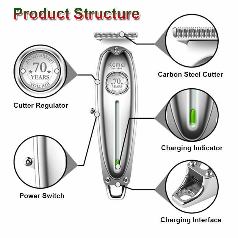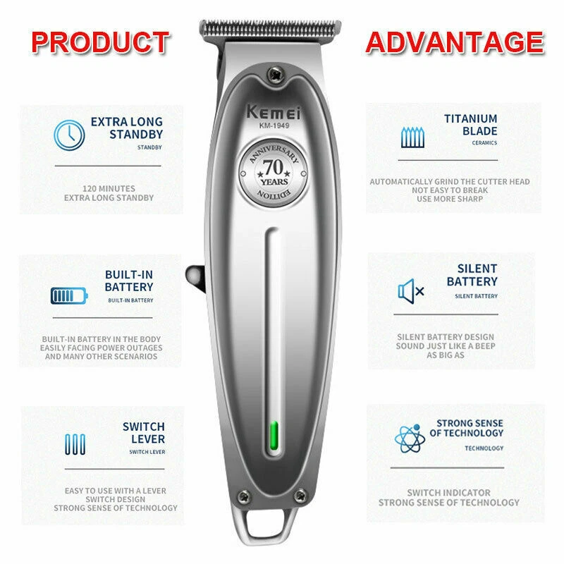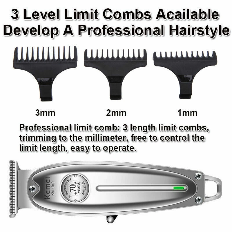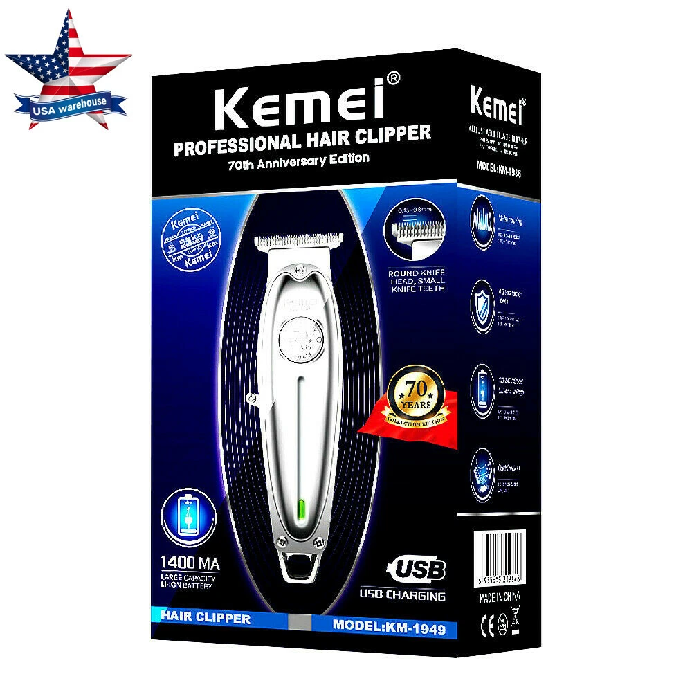 Kemei KM-1949 All-metal Professional Hair Clipper Electric Cordless Hair Trimmer Product Description Gender: Male, female. child Power Type: Rechargeable Use: Face, beard, moustache, barber Charging time: 2.5 hours Working time: 180 minutes Power: 5W Engine: very powerful Color: silver Material: metal Size : 16*4cm Package includes : 20.5*10.5*7.5cm Feature: All metal hair clipper professional barber tool , or home use 1400 mAh lithium battery fast charging and strong power *Combined with the ergonomic construction make this clipper top notch in both durability and comfort *Complete with a traditional steel set, its everything you need all in one *Innovative motor system drives power to both the precision hair clippers and the vacuum suction *Powerfully cut through even the thickest hair with ease *Professional Hair cutting kit features an easy-to-use compact clipper for multi-purpose grooming *Clipper has a durable, long-lasting powerful motor and self-sharpening precision ground blades that stay longer, provides accurate and consistent performance Package Included: 1 x Hair Clipper Host with Head 1 x Brush 3 x Limited Comb 1 x USB Cable 1 x User Manual