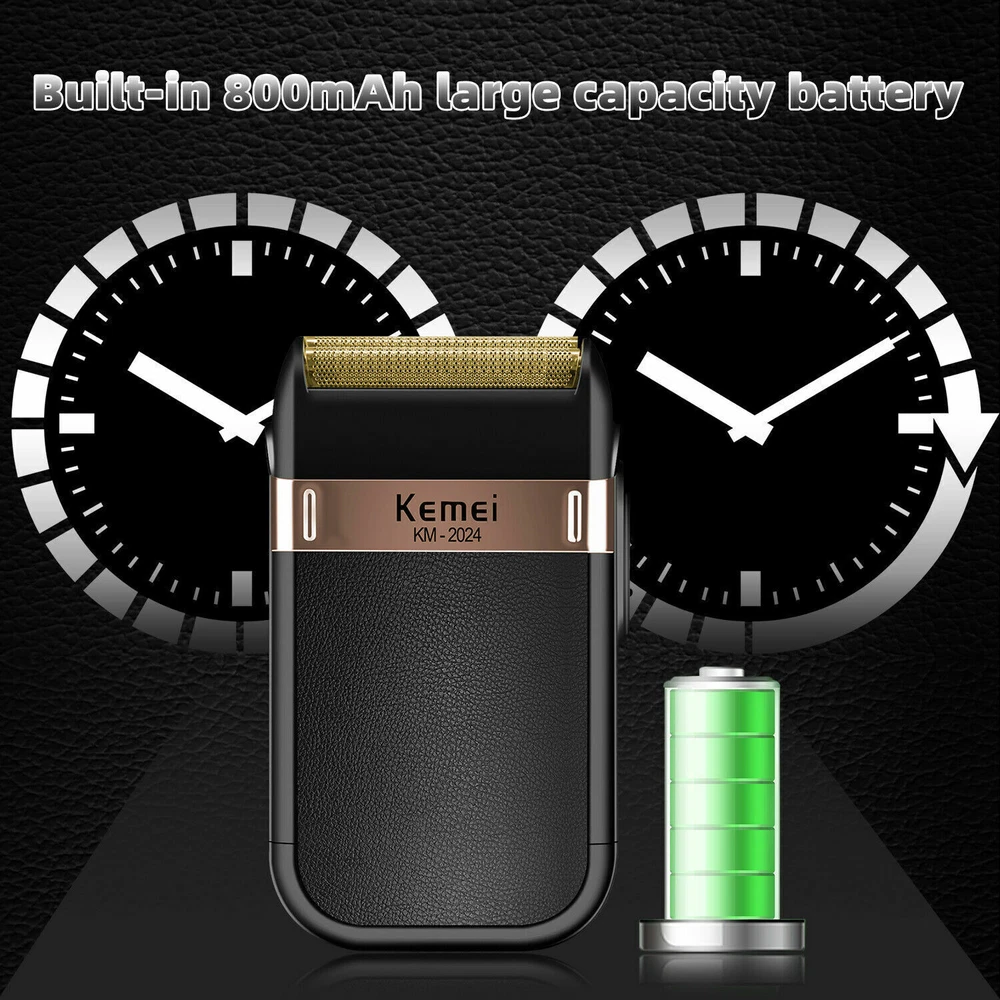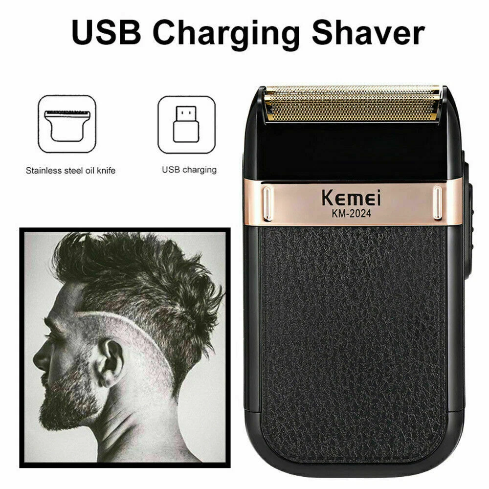 Men's Electric Shaver Trimmer Razor Rechargeable Hair Beard Shaving Machine Description: KEMEI KM-2024 Twin Reciprocating Mesh Blade Electric Shaver Waterproof USB Rechargeable Razor Barber Beard Shaving Trimmer Specifications: Brand Name: KEMEI Model: KM-2024 Power supply mode: USB charging Cleaning method: Whole body washable Full Charge time: 8 hours Razor blade: Twin Reciprocating Blade Maximum power: 3W Net weight: 100g Size: 120 X 60 X 30mm/4.72 X 2.36 X 1.18" Included: 1 X Shaver 1 X Mesh Blade 1 X Carrying/Travel Velvet Bag 1 X Cleaning Brush 1 X USB Charging Cable Notes: 1. Due to the different monitor and light effect, the actual color of the item might be slightly different from the color showed on the pictures. Thank you! 2. Please allow 1-3mm measuring deviation due to manual measurement.