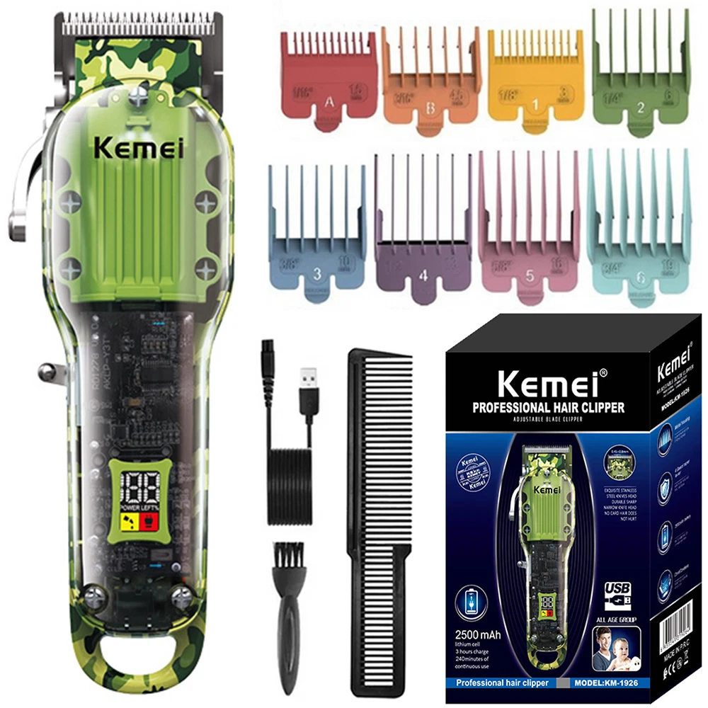 Features: 1.Powerful long-life motor cute-angled moving blade, sharp and durable 2.Considerate and digitalized smart LCD display for reminder, 6300rpm/min strong power, Less than 55dB low noise, Once charging can last up to 240-min working time 3. Newly designed acrylic material, sturdy and durable, with a beautiful appearance, you can directly see the internal parts. Specification : Brand : KM-1926 Machine Weight : 267g Machine Size : 18*4.5*3cm / 7*1.7*1.2 Inch Voltage : 100-240V Frequency : 50/60Hz Batt e ry : 8W Charging Time : 3 Hours Using Time : 240 Mins Power Supply : USB Recharge Cleaning Way : Cleaning With Brush Package list : 1 * Hair clipper 8* Limit combs (1.5/3/4.5/6/10/13/16/19mm) 1 * USB cable 1 * Cleaning brush 1*Manual