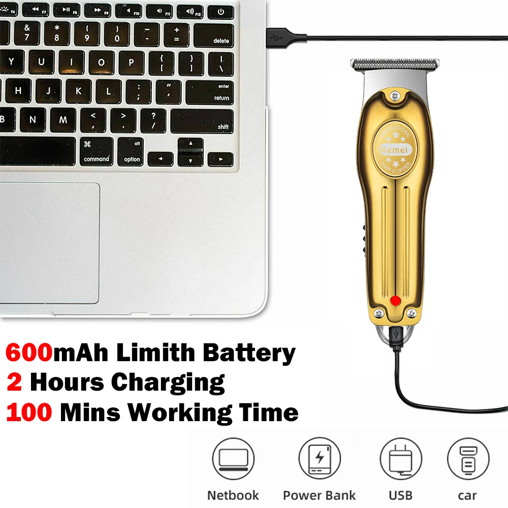 Describe: Professional barber tool, or use at home. Stainless steel blade, avoid skin irritation, very hot, does not pull hair, blade width 45mm. Low noise, high power. Ergonomic and stylish handle design, comfortable to hold and operate. Note: Due to air transport restrictions, liquids cannot be transported, so oil bottles are not included in the package, please note. Due to manual measurement, there is a size error of about 1-5mm. Due to different monitor calibrations, the colors of the items shown in the photos may appear slightly different on your computer monitor. Product parameters : Brand: Kemei Model: KM-679 Product name: hair clipper Color options: Gold/Sliver Charging method: USB charging Battery Weight: 600mAh Voltage/Power: 3.7V/5W Weight size: 125g/4*13.8cm Use time: 2 hours of charging, 100 minutes of use Product acessorie s : 1*Host 1*protective cover 3*limiting comb (1/2/3)mm 1*USB cable 1*Cleaning brush