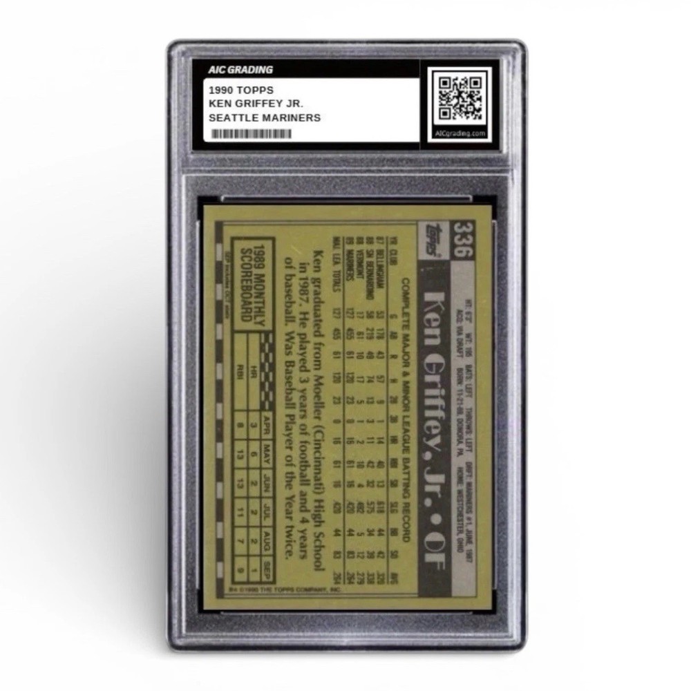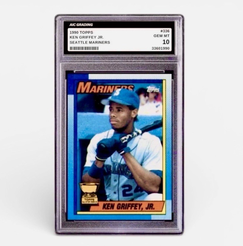 The product is a highly coveted Ken Griffey Jr Topps Rookie card from 1990, graded as a rare 10 Gem Mint. This official rookie card features the legendary baseball player in his early career with the Seattle Mariners. As a first edition card from Topps, it is an original piece of sports memorabilia that holds significant value for collectors and fans of MLB baseball. Its pristine condition and high grade make it a prized possession for any baseball card enthusiast.