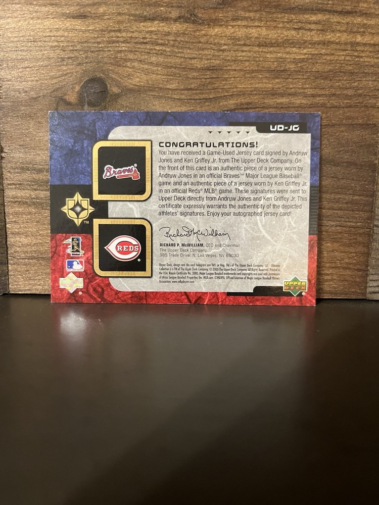 The product is a highly collectible 2005 Upper Deck Ultimate Collection Game Used Dual Auto card featuring baseball legends Ken Griffey Jr and Andruw Jones. This limited edition card has and is signed by Ken Griffey Jr. It is part of the DUAL PATCH AUTO MATERIALS series and includes a patch from the Cincinnati Reds and Braves teams of the 2005 . This rare sports trading card is a must-have for fans of the iconic players and collectors of baseball memorabilia.