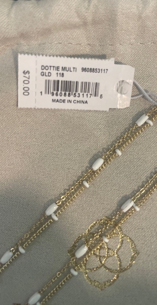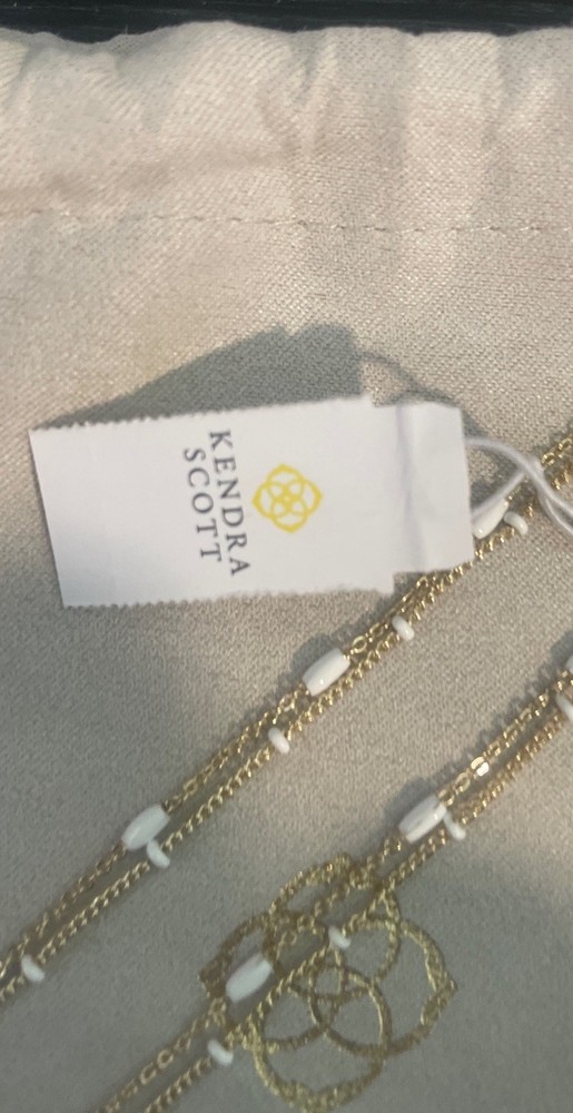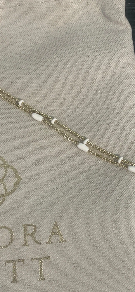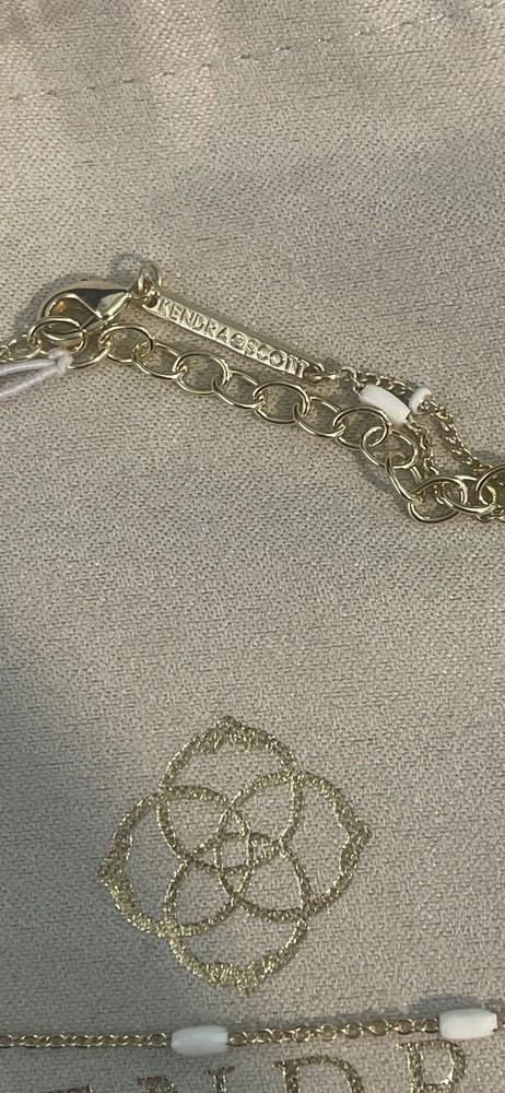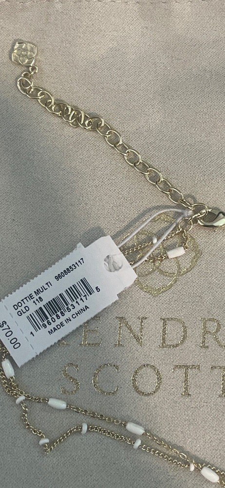 The Kendra Scott Dottie gold color Multistrand Necklace with White detail is a stylish and elegant piece of jewelry. With a lobster closure, this necklace features multiple chains adorned, adding a touch of sophistication to any outfit. The combination of gold and white colors gives it a versatile and chic look, making it a perfect accessory for various occasions. NWT Includes jewelry bag 16” 3” extender