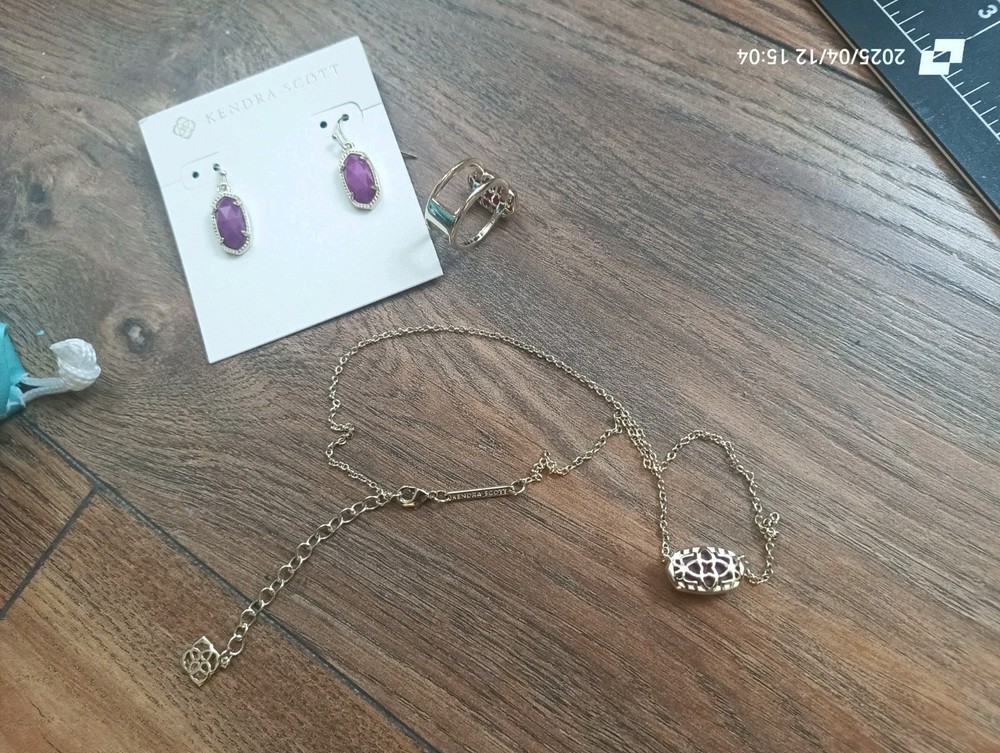 KENDRA SCOTT..SILVER (Rhodium).JEWELRY SET Includes Necklace-Elisa- 15"-17"- has Kendra Scott bar at the end of necklace Earrings- Elle Drop Earrings, Ring- Elyse Ring -sz 6 ring and Kendra Scott jewelry storage bag. I'm not positive about the color, but I'm pretty sure it's Maroon Jade Color. Also not sure what the stone is. In the 2nd picture you can see the BAR on the necklace and the back of it and the ring. Retail from website is $196.00 I state 3 day shipping time, but that is bc of my carrier. I typically ship the next day. This stunning jewelry set by Kendra Scott is a must-have for any fashion-forward individual. The set includes a beautifully crafted necklace and matching earrings, perfect for completing any outfit. The intricate details and unique design make this set a true work of art, sure to turn heads wherever you go. Crafted with the highest quality materials, this set is made to last and will remain a cherished addition to your jewelry collection for years to come. Whether you're dressing up for a special occasion or simply adding some sparkle to your everyday look, this Kendra Scott jewelry set is the perfect choice.