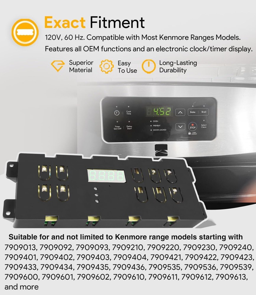 Range Oven Control Board forKenmore Frigidaire Range Clock Timer Timer Display PCB 【Interchangeable Part Number】 Replacement for 316557118 Frigidaire Range Clock Timer Control Board replaces 316418208, 316557108, 316557118, 1794486, AH3409083, AP4587739, EA3409083, PS3409083. 【Wide Compatibility】 Compatible With Most Frigidaire Ranges . Also Compatible with Electrolux Frigidaire Gibson Kelvinator Westinghouse and others . Suitable for some Kenmore range models starting with 7909013, 7909092, 7909093, 7909210, 7909220, 7909230, 7909240, 7909401, 7909402, 7909403, 7909404, 7909421, 7909422, 7909423, 7909433, 7909434, 7909435, 7909436, 7909535, 7909536, 7909539, 7909600, 7909601, 7909602, 7909610, 7909611, 7909612 and 7909613. 【Control Board Upgrade】 OEM replacement control board part fixes the symptoms of little to no heat when baking. Monitors the temperature and controls the oven heat. Controls the temperature in the oven for the bake and broiler settings. Features all OEM functions and an electronic clock / timer display. Designed and engineered to exact specifications. 120 V, 60 Hz 【Safe & Stable Work】 DC92-01596D PCB Main is manufactured with premium PCB materials for durability and exact fit. Excellent moisture resistance for stable performance and reliable durability. Work well with the original wiring as with the updated wiring. If the oven does not bake or broil then it is possible the circuit board has failed. Both heating elements can be tested to determine if the problem is with the element or the control board. 【100% Satisfaction Guarantee】 Your satisfaction is our priority. We strive to give our customers excellent service. All our products support 30-Day money-back guarantee, 12-Month warranty for quality-related issues. Simply return it for your warranty. 1.All Payments must be Confirmed (Shipping and billing addresses must match) Payment is required within 7 days from the date of the auction ending. 2.We accept PayPal, MasterCard, Visa, American Express, Discover and etc payment. 1.Orders will be ship out within 1 business days via USPS, Or UPS . (Orders from Saturdays, Sundays or holidays will process on next business day and will be ship within 24 hours. ) 2.All of the items are shipped from our Warehouse in USA.It will take about 3 to 5 business days to you. 3.Any defective items received can be replaced or refunded. Please contact us with the item number, eBay ID and defect description. 1.100% Satisfaction Guarantee: If you're not 100% satisfied with our items, simply return it for a full refund in 60 days (Items must be in new condition and in original package). Kindly please feel free to contact us before return. 2.Return or Replacements: Support 12 months' Warranty. All product will be tested in 100% before delivery. If the item is was damaged in transit, kindly please contact us for a replacement or refund (Excluding contrived damage or misuse). Any question, please don’t hesitate to let us know. We try our best to reply to your emails as soon as possible, due to high volume of daily incoming emails, we may not be able to reply your emails immediately. Please allow 24 hours for us to response. your understanding and patience is much appreciated!