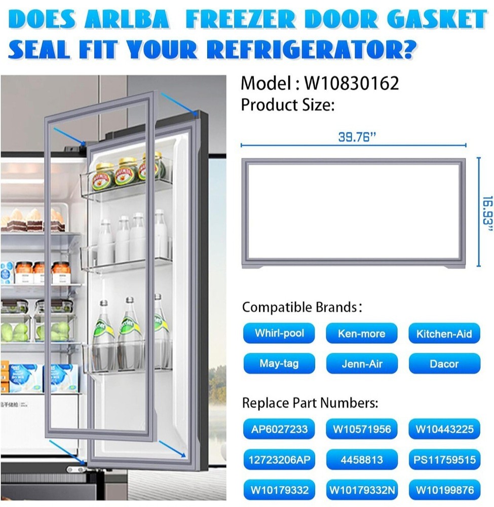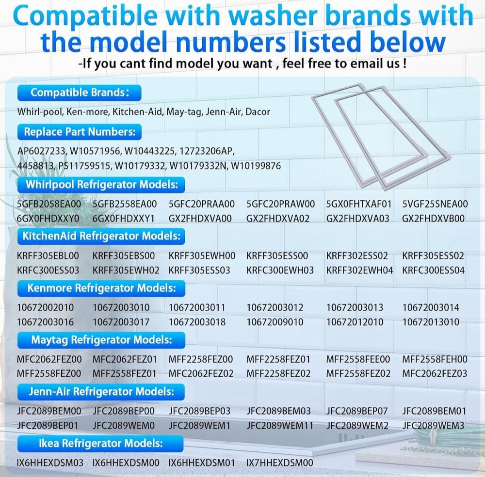 Model:Whirlpool Jenn Air Maytag Kenmore Number of Items in Set:1Size:W 16-7/8 (in) * H 39-3/8 (in)Suitable For:RefrigeratorBrand:ArlbaColor:GraySet Includes:Seal/GasketType:Refrigerator Door GasketUPC:Does not applyPackage Note:You Will Receive 1 Packagegtin13:Does not applyMaterial:EPDM