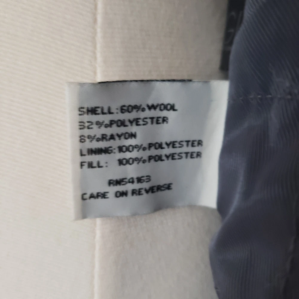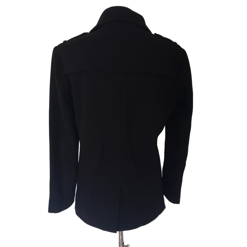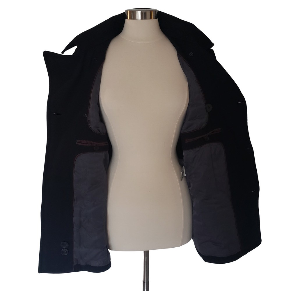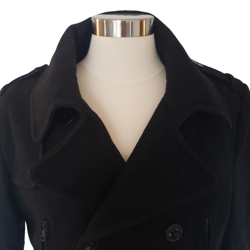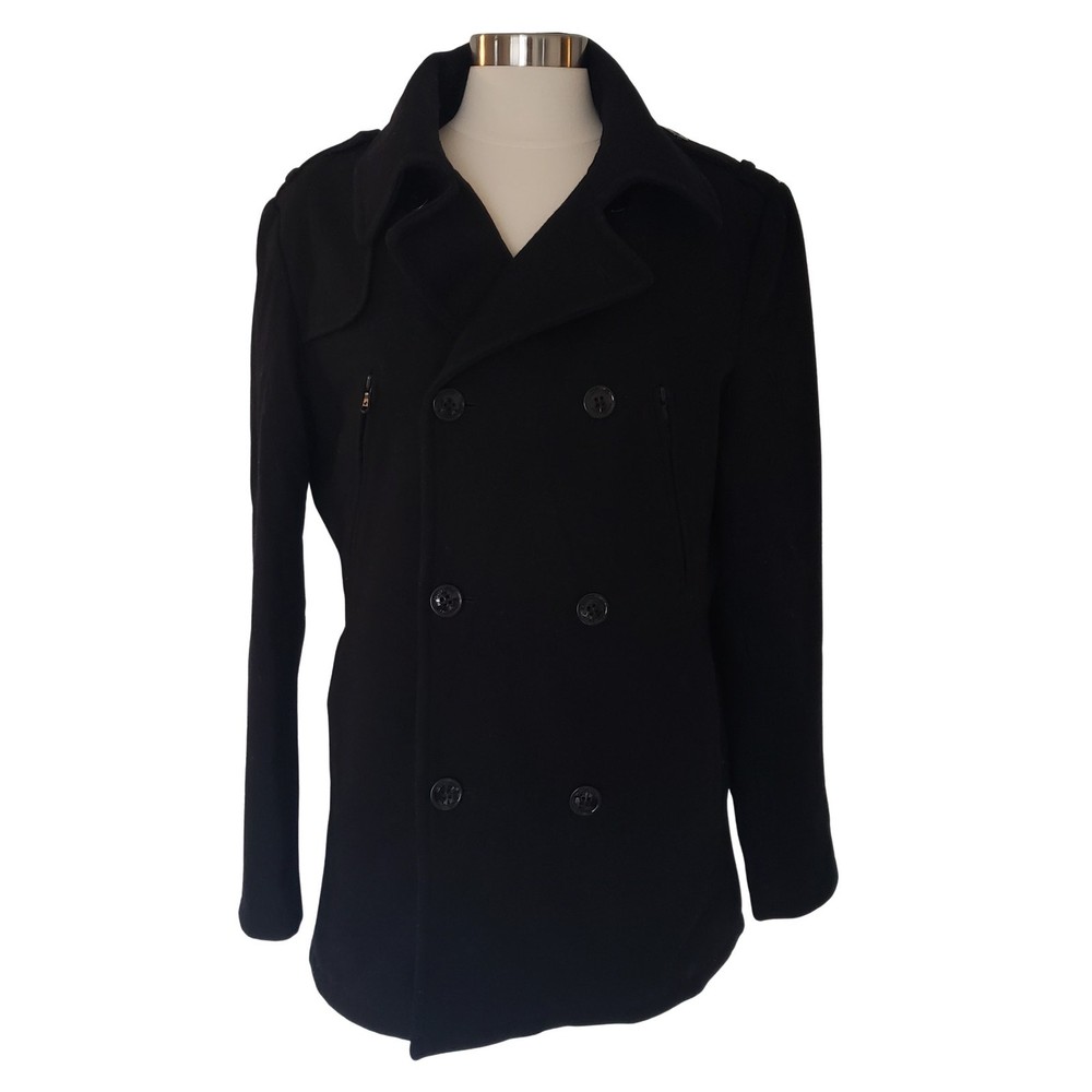 Kenneth Cole Double Breasted Black Wool Blend Peacoat Size Small Excellent Pre-Owned condition. Size Small Double Zipper on each side Interior pockets on both sides 60% Wool / 40% Polyester Flat Lay Measurements: Chest: 21.5" (I spared a half inch due to padding_ Length: 29" Sleeve: 24.5