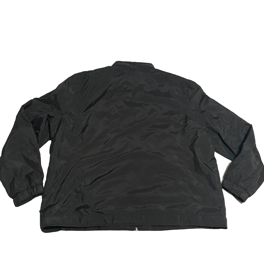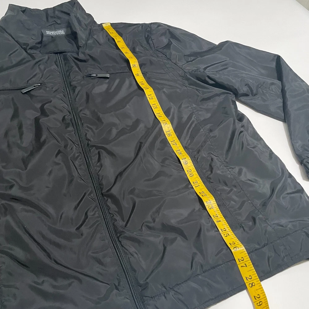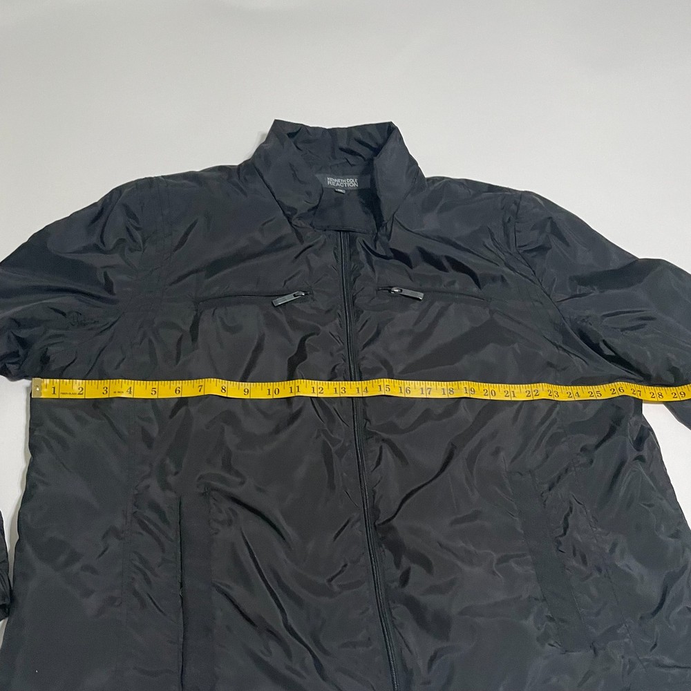 The Kenneth Cole Reaction Black Full Zip Jacket in Men's XXL is a versatile and stylish outerwear option suitable for various occasions. Made of lightweight polyester with a solid black color, this jacket features a full zip closure and a comfortable polyester lining. The windbreaker style and softshell fabric make it ideal for travel, casual wear, or walking activities during all seasons. Easy to care for with machine washable garment care, this jacket combines practicality with the Kenneth Cole Reaction brand's quality and style.