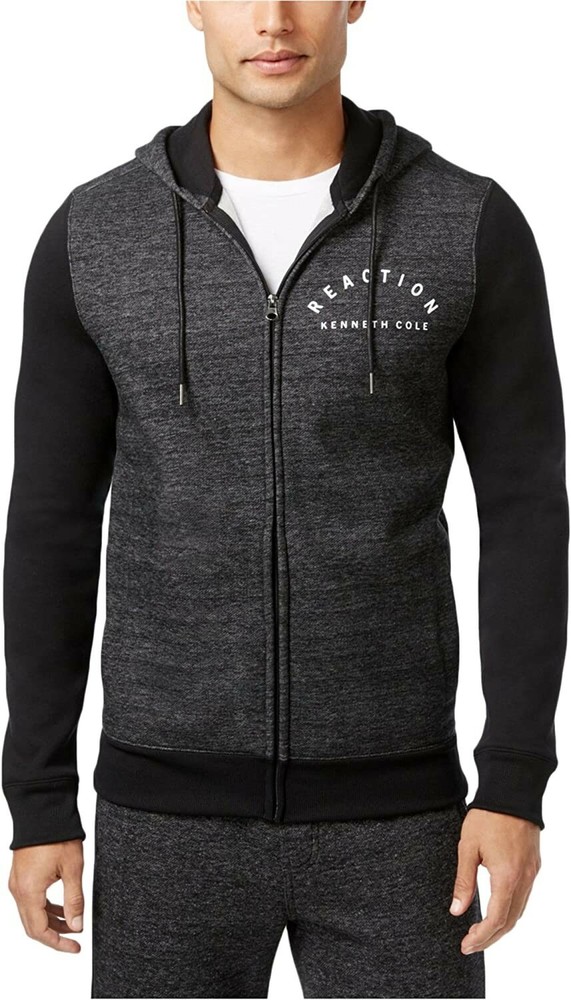 Kenneth Cole Reaction Contrast Hoodie Full-Zip Hoodie Hardly Worn. Color: Black & Grey Style: RMH6BKL27 Size: Men's Medium Collar Style: Crew Neck Material: 65% Polyester 35% Cotton Features: Drawstring(s),Ribbed Cuffs,Ribbed Hem Season: All Seasons Density: Medium Weight Sleeve Length: Long Sleeve Occasion: Casual Theme: Modern Additional Details: Casual, simple, comfortable. stylish. Allover heathered pattern with smooth texture. Contrasting sleeves and hem; graphic logo print at left chest. Two hand pockets at waist.