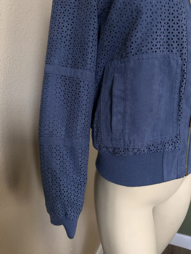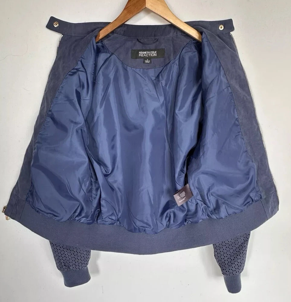 This Kenneth Cole Reaction Bomber Jacket for women features a stylish design with cut out details all over, a full zip closure, and a mock neck. Made of polyester knit fabric, this jacket has a solid blue color with a short length and long sleeves. It has pockets for added functionality and is suitable for all seasons. This classic designer piece is versatile, offering a modern and chic look for any occasion. SMOKE FREE HOME CROSS LISTED