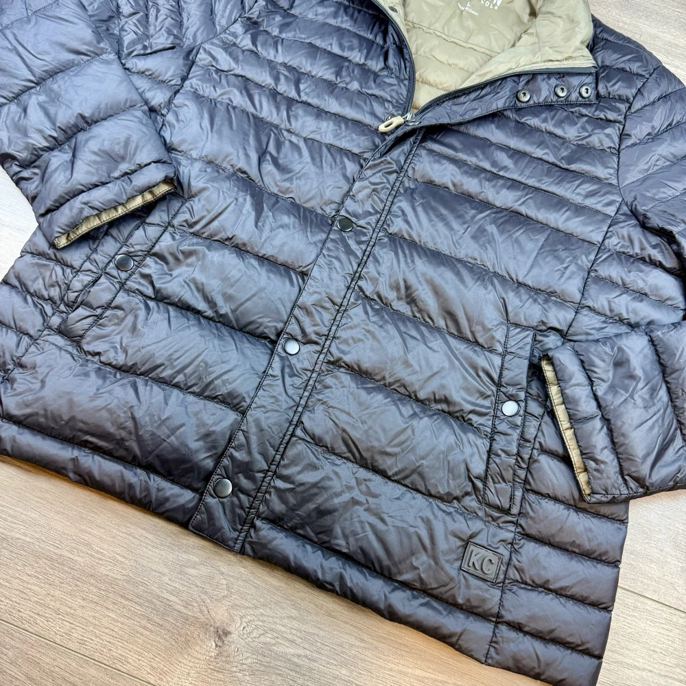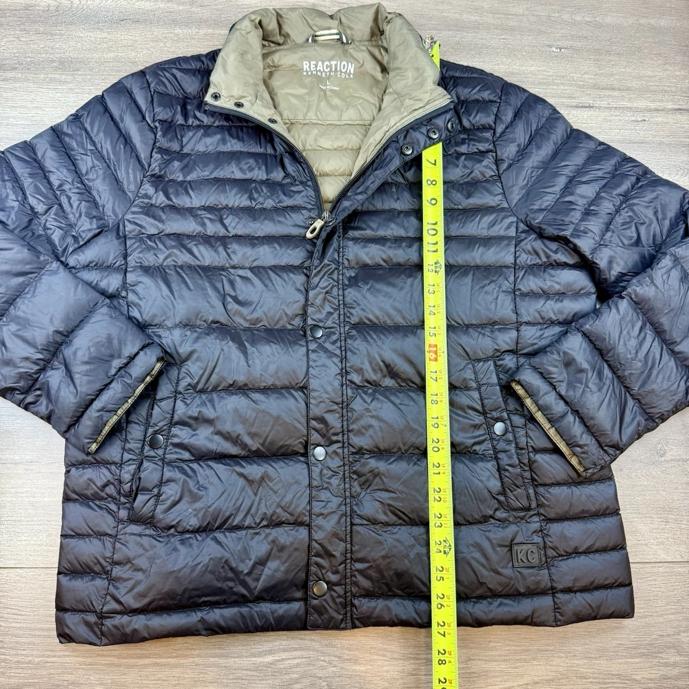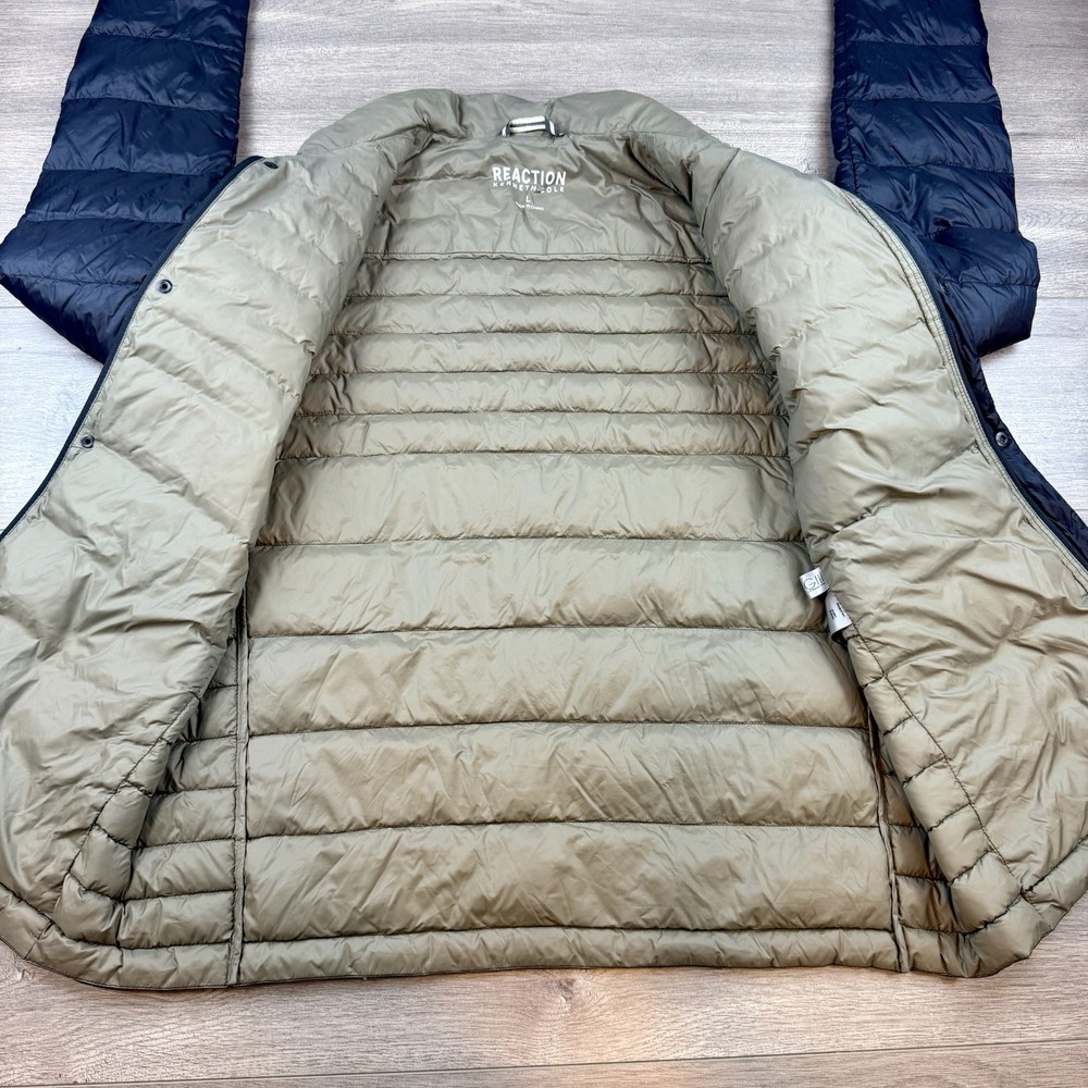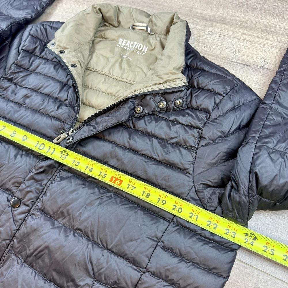 The Kenneth Cole Reaction Puffer Quilted Duck Down Coat is a stylish and functional outerwear piece for men. Made with a nylon outer shell and insulated with down, this mid-length coat provides warmth and protection in cold weather. The full zip and snap closure, along with its windproof and water-resistant features, make it ideal for travel and casual occasions. The classic black color and solid pattern give it a timeless and designer appeal, perfect for outdoor activities in winter, fall, and spring. Easy to care for with machine washable instructions, this coat is a versatile and practical addition to any man's wardrobe. Men's Large Black Lightweight Winter Thermal Pockets Water Resistant Windproof Please see pictures for condition and size measurements. Thanks!