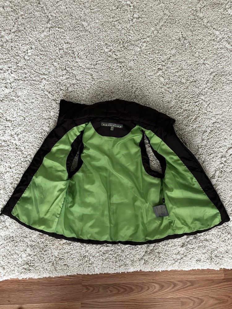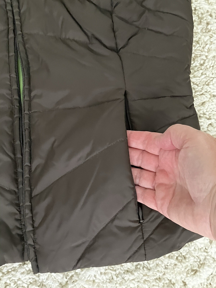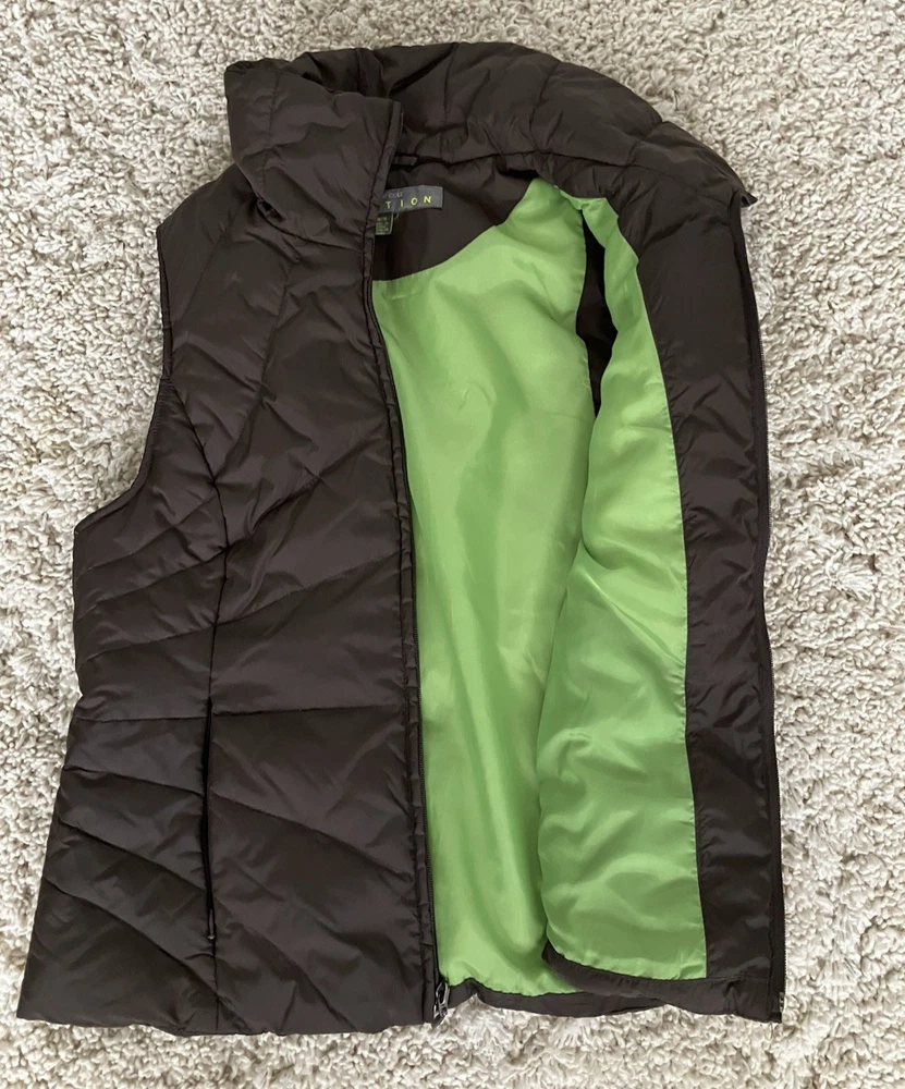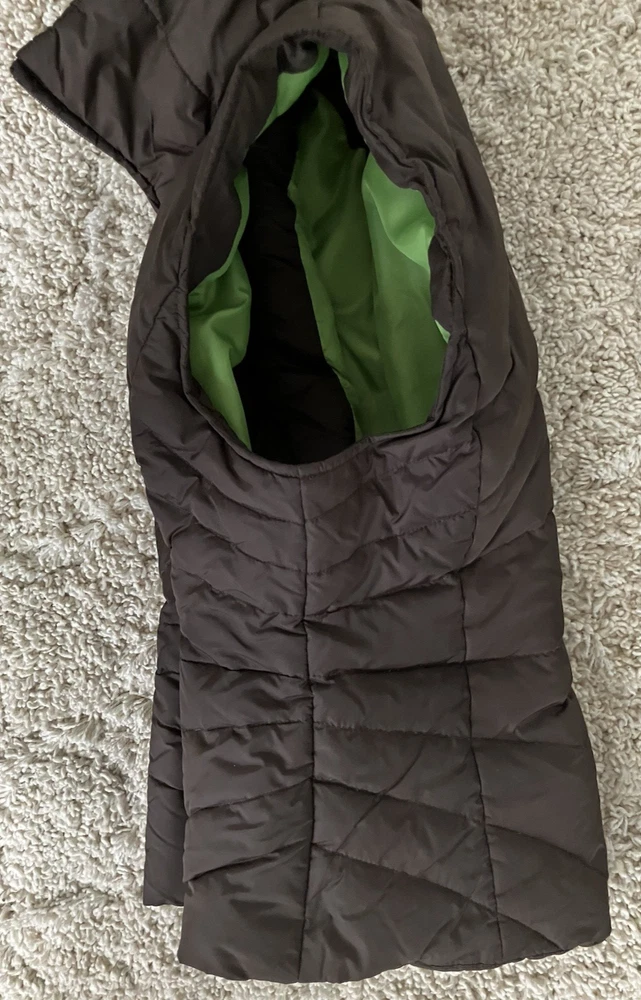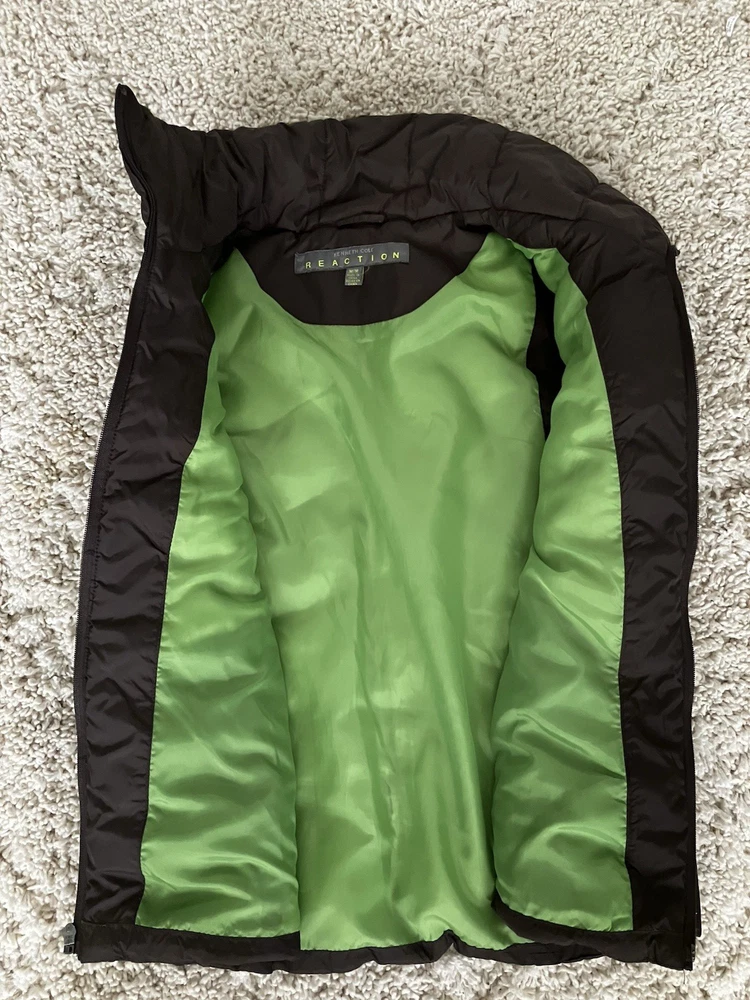 This nice down puffer Jacket has a beautiful dark brown outer layer and a green inside to add a little pop. It can be worn open or zipped. It includes two Zippered pockets to keep items safe. The sides are slightly elastisized so as not to have that blocky square look. Add it to your fall wardrobe!