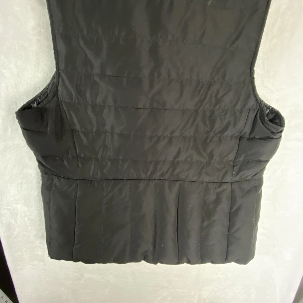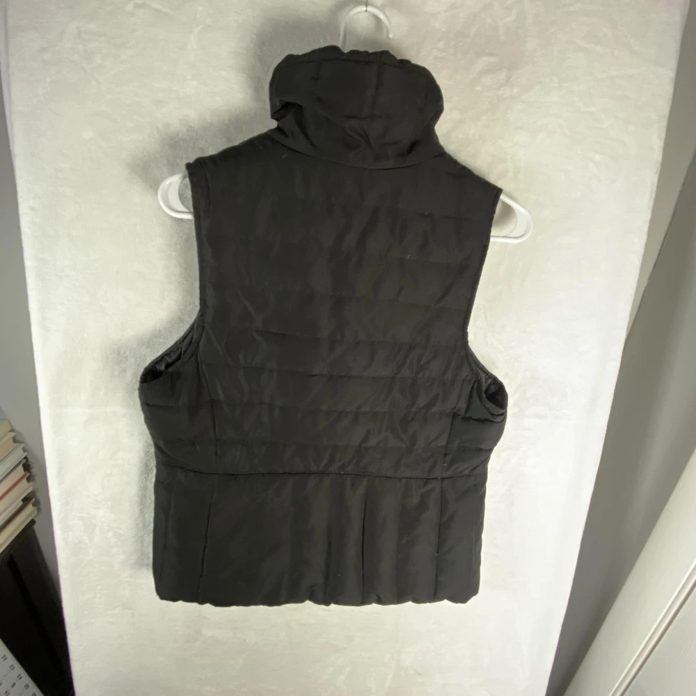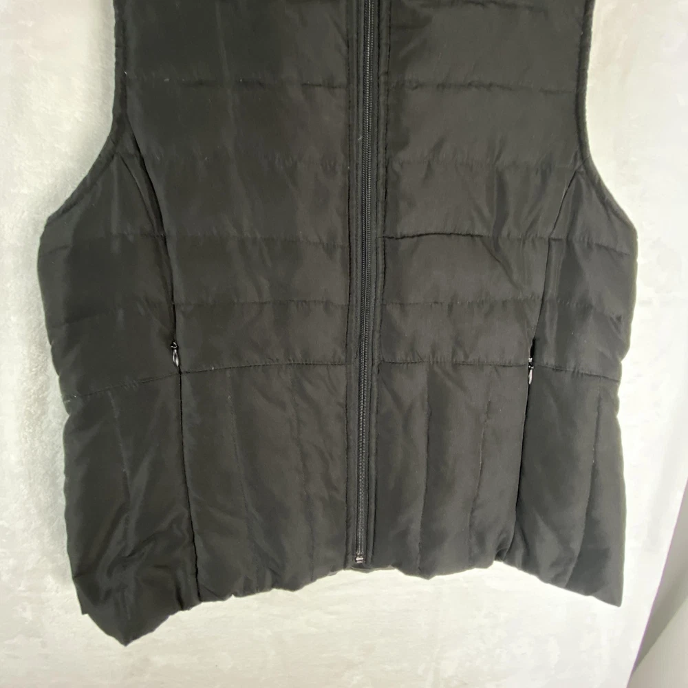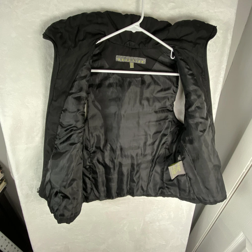 Kenneth Cole Reaction Vest Womens Medium Black Down Puffer Full Zip Quilted Previously worn with light overall fabric wear and a few small lint specks from use and storage. Zipper and pockets function properly; lining clean and intact. No holes, stains, or tears; interior tags present and original retail tags not included. Brand: Kenneth Cole Reaction Item: Womens down-insulated puffer vest with stand collar and full front zip closure. Color: Black (tag code BLK). Size on tag: M/M (Womens Medium, regular fit). Shell material: 100% polyester; lining: 100% polyester; filler: 60% down, 40% feathers. Design details: Horizontal quilted body, tall padded stand collar, smooth polyester lining, front zip closure, zip hand pockets, additional chest pocket, solid black exterior. Inner tag codes: 17KT7019 and 177CD423. Care instructions (per tag): Machine wash cold on delicate with like colors, only non-chlorine bleach when needed, tumble dry low with clean tennis balls, remove promptly, cool iron if needed, do not dry clean. Made in China. 2523