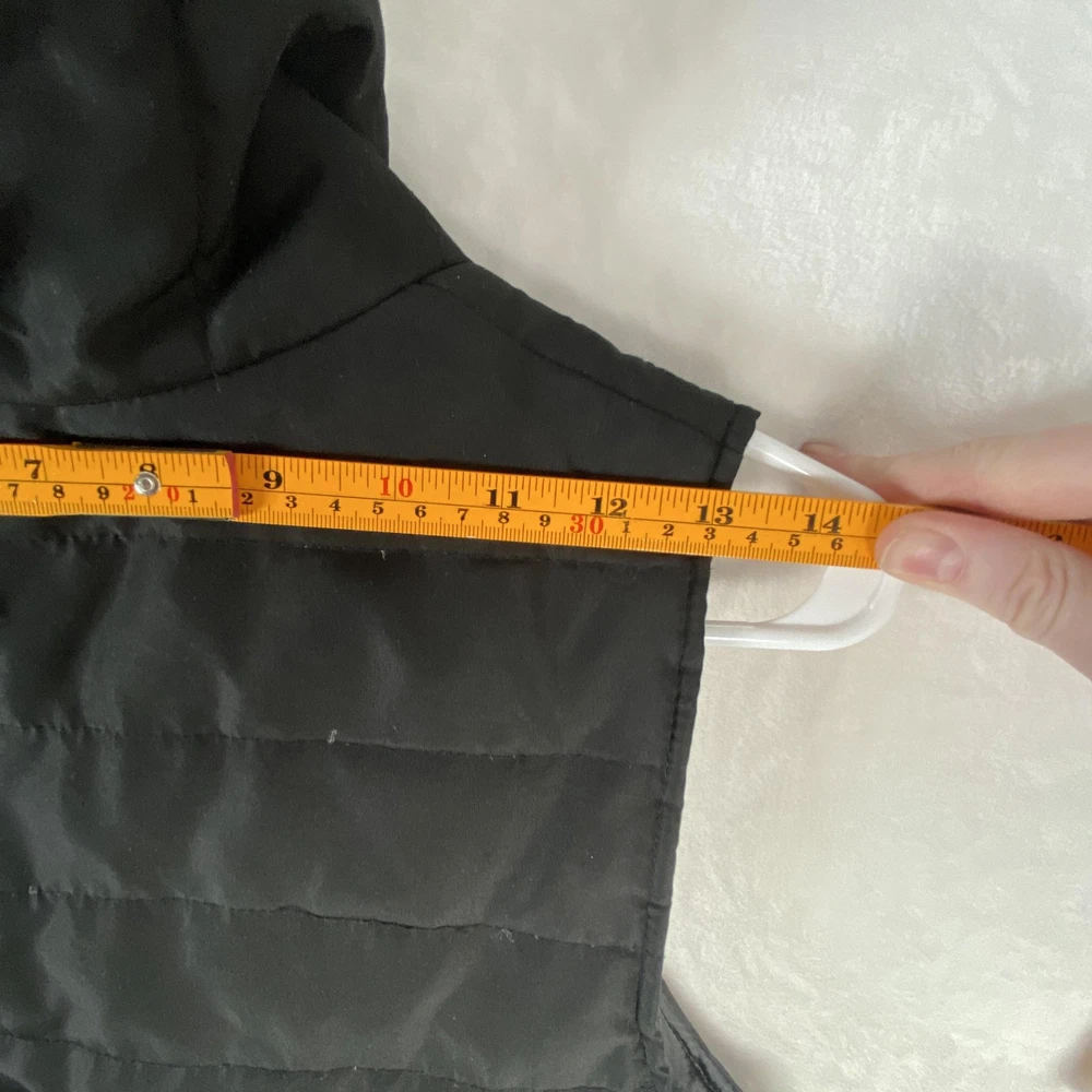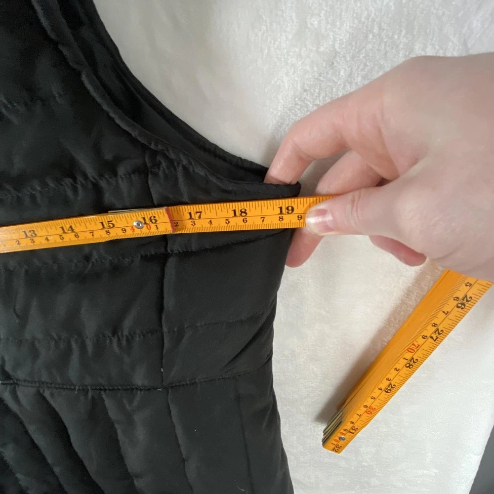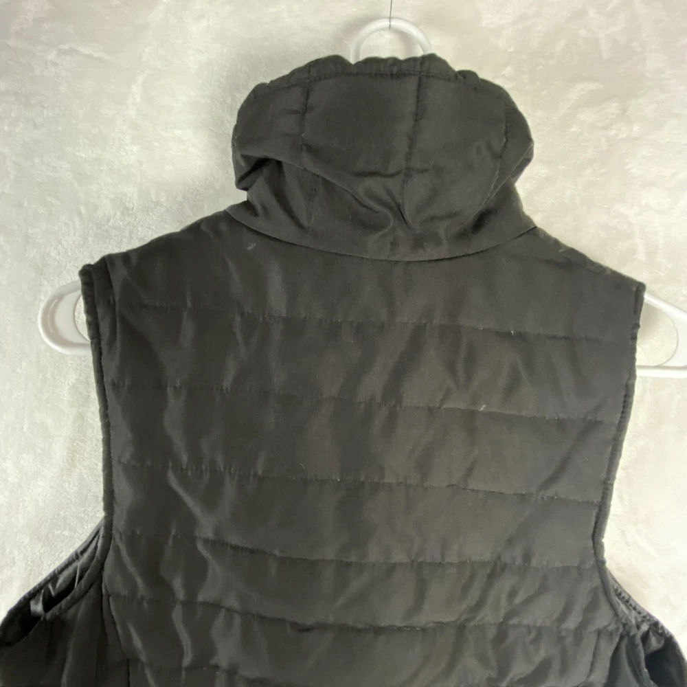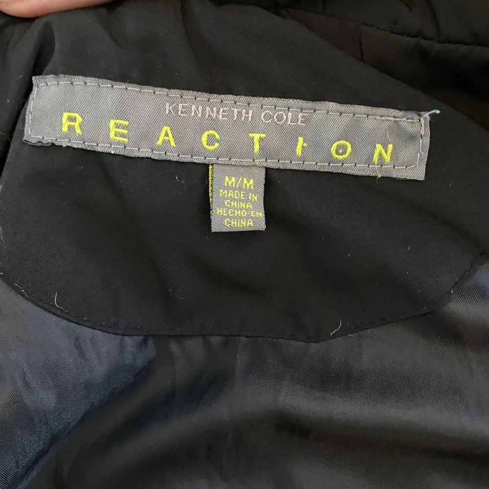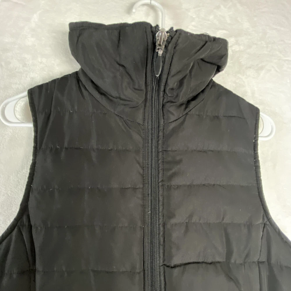 Kenneth Cole Reaction Vest Womens Medium Black Down Puffer Full Zip Quilted Previously worn with light overall fabric wear and a few small lint specks from use and storage. Zipper and pockets function properly; lining clean and intact. No holes, stains, or tears; interior tags present and original retail tags not included. Brand: Kenneth Cole Reaction Item: Womens down-insulated puffer vest with stand collar and full front zip closure. Color: Black (tag code BLK). Size on tag: M/M (Womens Medium, regular fit). Shell material: 100% polyester; lining: 100% polyester; filler: 60% down, 40% feathers. Design details: Horizontal quilted body, tall padded stand collar, smooth polyester lining, front zip closure, zip hand pockets, additional chest pocket, solid black exterior. Inner tag codes: 17KT7019 and 177CD423. Care instructions (per tag): Machine wash cold on delicate with like colors, only non-chlorine bleach when needed, tumble dry low with clean tennis balls, remove promptly, cool iron if needed, do not dry clean. Made in China. 2523