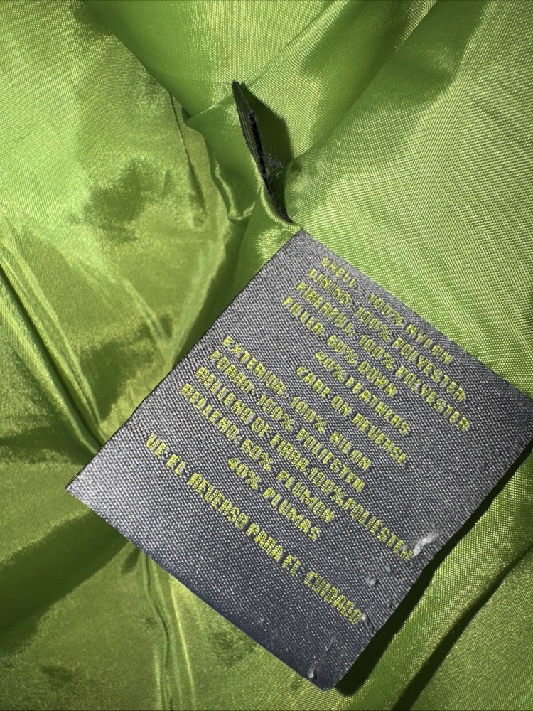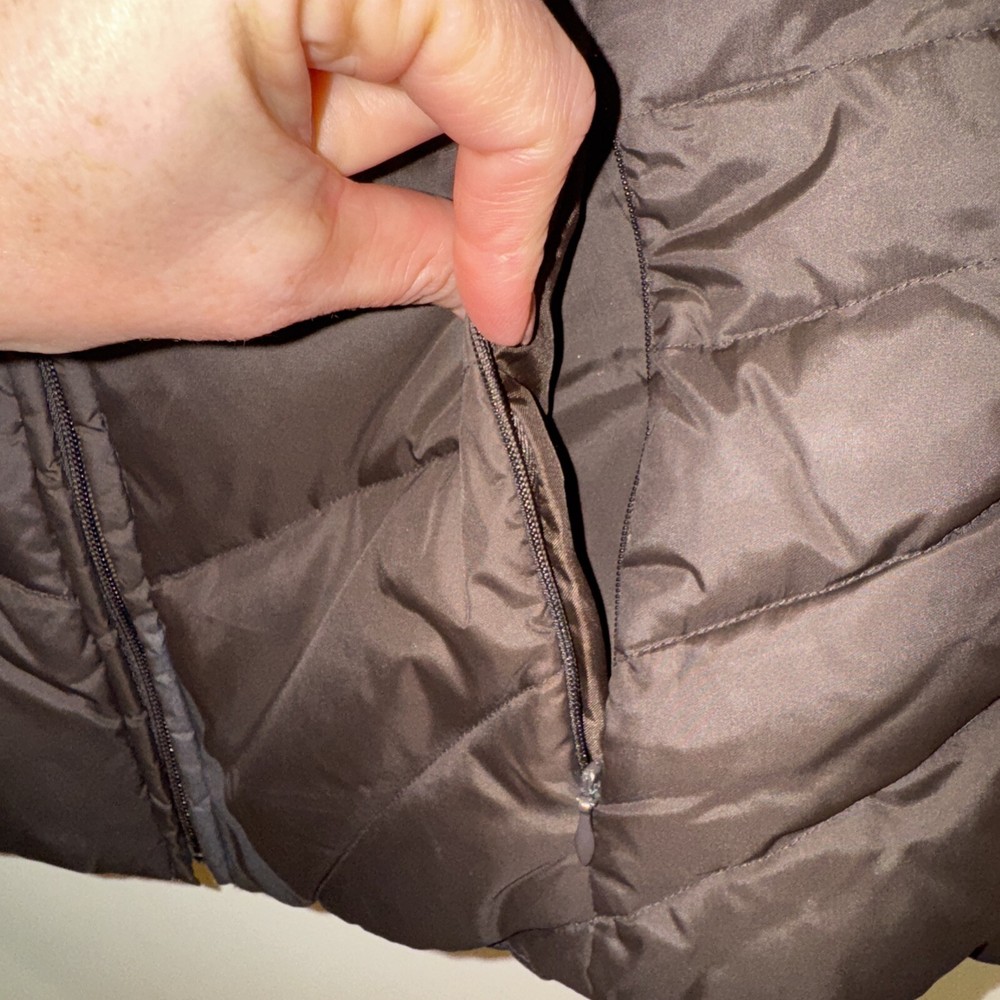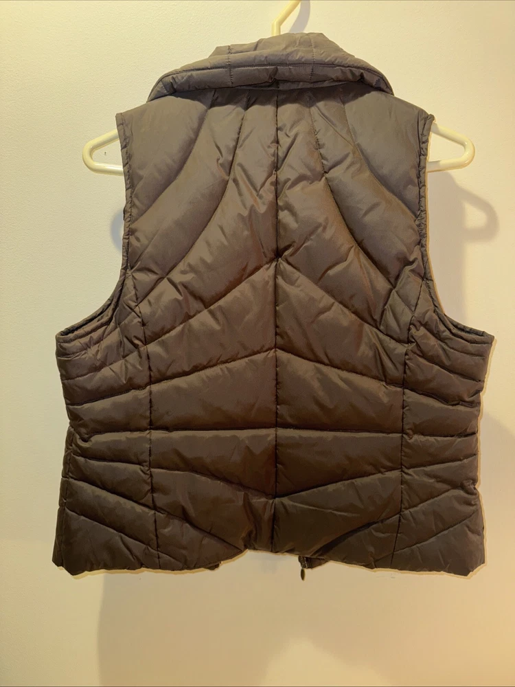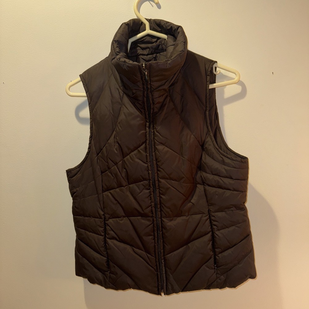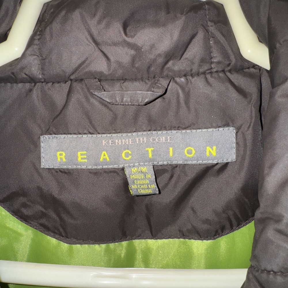 This is a Kenneth Cole Reaction puffer vest for women in size Medium. The vest features a full zip closure, sleeveless design, brown color, softshell fabric, and down insulation. It has a modern style with zipper accents and zipper pockets. Suitable for winter and fall seasons, this mid-length vest is machine washable and lined with polyester.