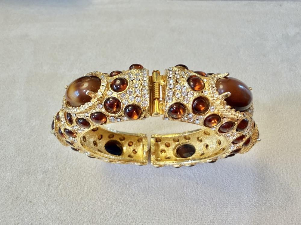 The Kenneth Lane KJL Vintage 1960s Jewels Of India Mughal Cabochons Bangle Bracelet is a stunning piece of vintage jewelry featuring Mughal cabochon stones set in a bangle style bracelet. The rich history and intricate design of this bracelet reflect the brand's commitment to creating high-quality and unique pieces. Perfect for adding a touch of vintage glamour to any outfit, this bracelet is a timeless accessory that speaks of elegance and sophistication.
