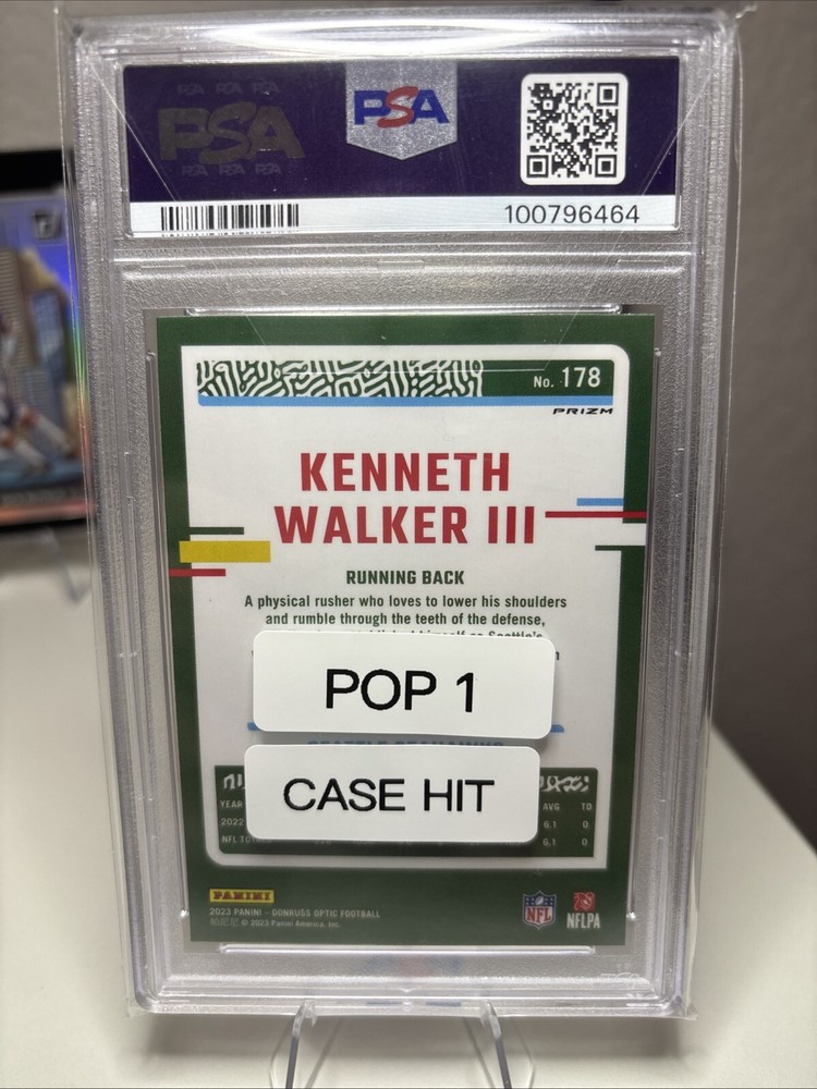 The product is a Kenneth Walker III sports trading card from the 2023 Donruss Optic set, manufactured by Panini. The card features an error and is a rare insert case hit. It is part of the Optic parallel/variety and is not autographed. The card represents the Seattle Seahawks team in the National Football League (NFL).