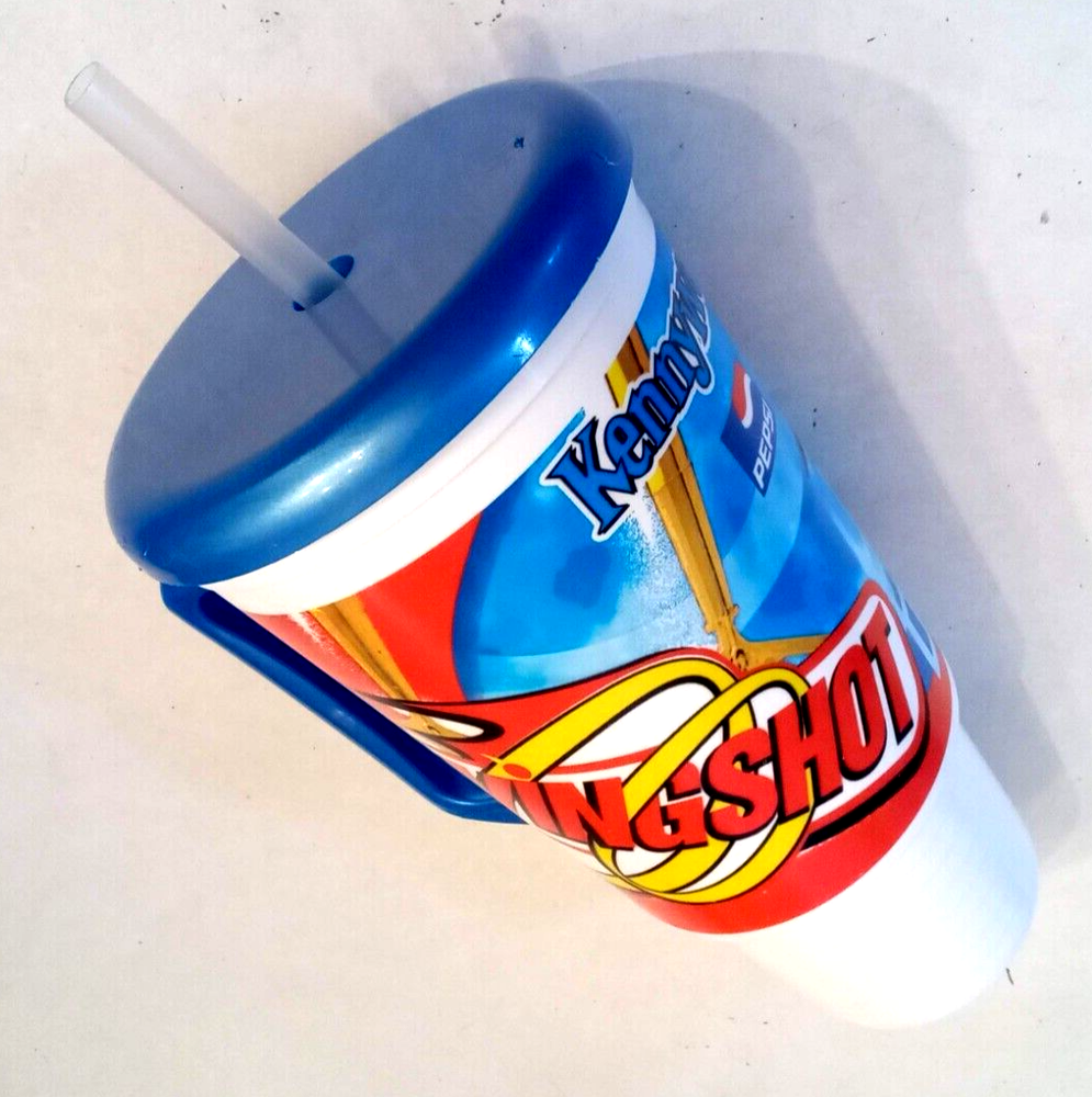This Kennywood Park souvenir drink mug showcases the SWINGSHOT ride at Kennywood Park in Pittsburgh PA. It features brightly colored graphics and a 32 oz capacity that is perfect for cold beverages. . The multicolor plastic cup includes a lid, straw, and handle for easy use and stands about 8" tall. This original Whirley Pop item is from the rides introductory season in 2006 Combined Shipping Discounts Available. Please use the cart button feature in the listings to shop my store and combine your purchases.