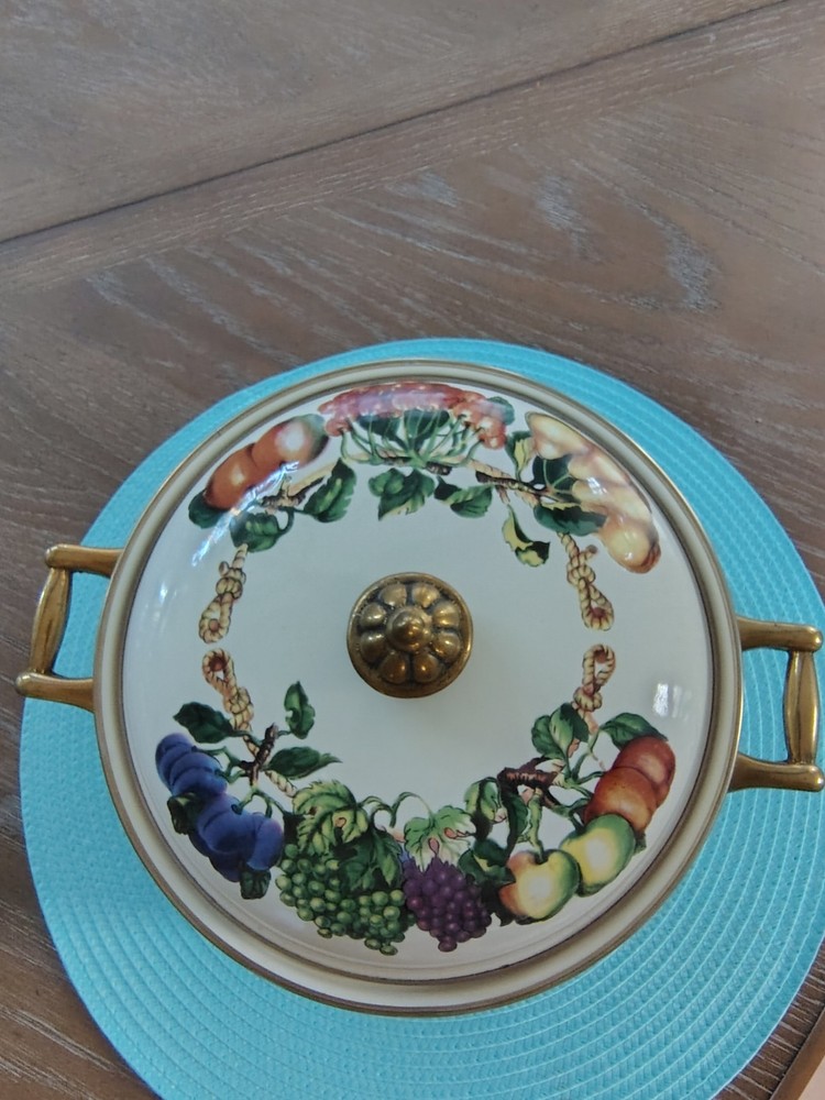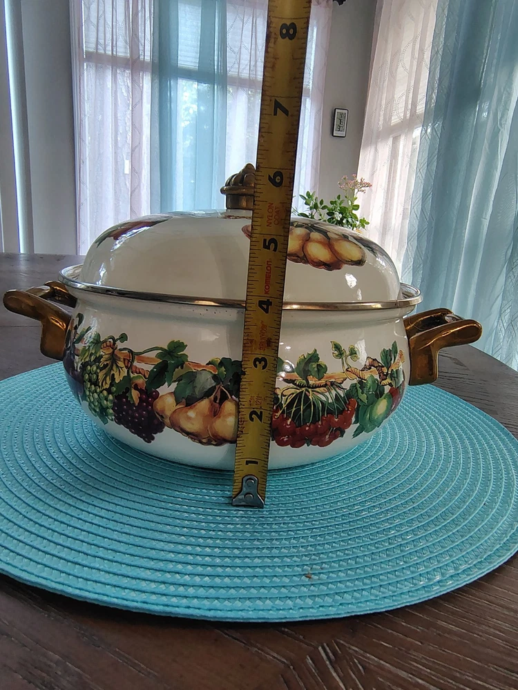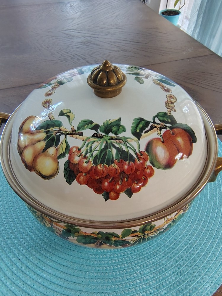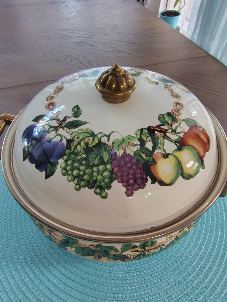 Stove Type Compatibility:Electric, Gas, InductionItem Height:4 inSet Includes:Lid, PotAntique:NoTime Period Manufactured:1980-1989Number of Items in Set:Two-PieceFeatures:Double Handle, Flat-Bottomed, With LidType of Oven:Electric, Gas, InductionSurface Coating:CeramicColor:MulticolorVintage:YesBrand:Tabletops UnlimitedShape:RoundCountry/Region of Manufacture:ThailandType:Dutch OvenMaterial:VitroceramicItem Diameter:9Original/Licensed Reproduction:Original