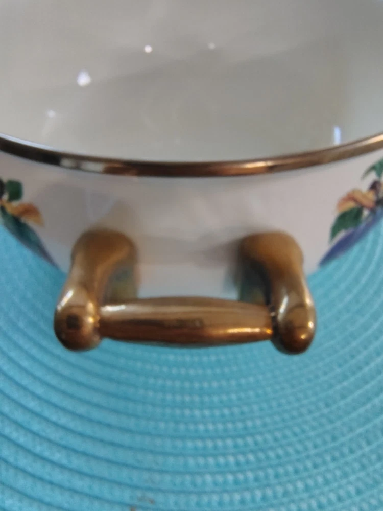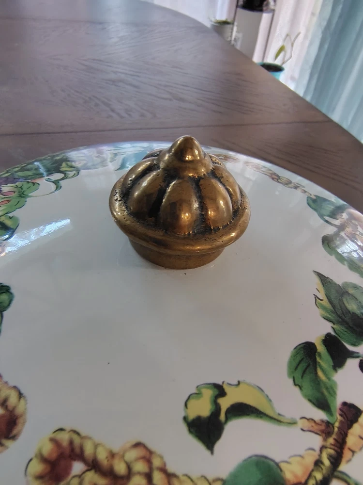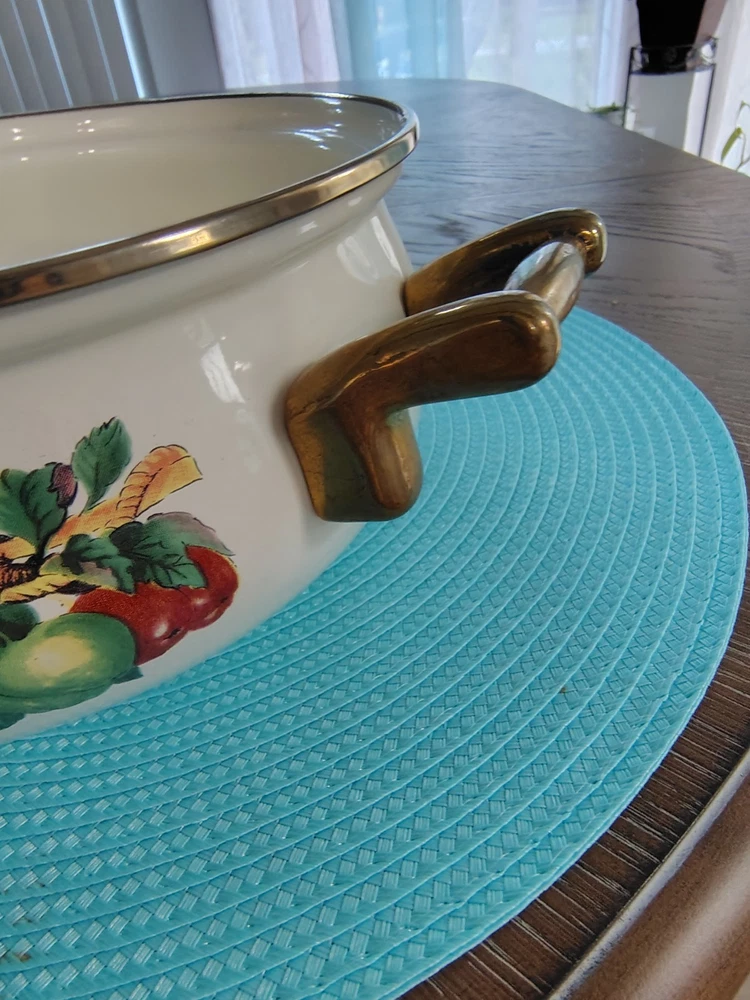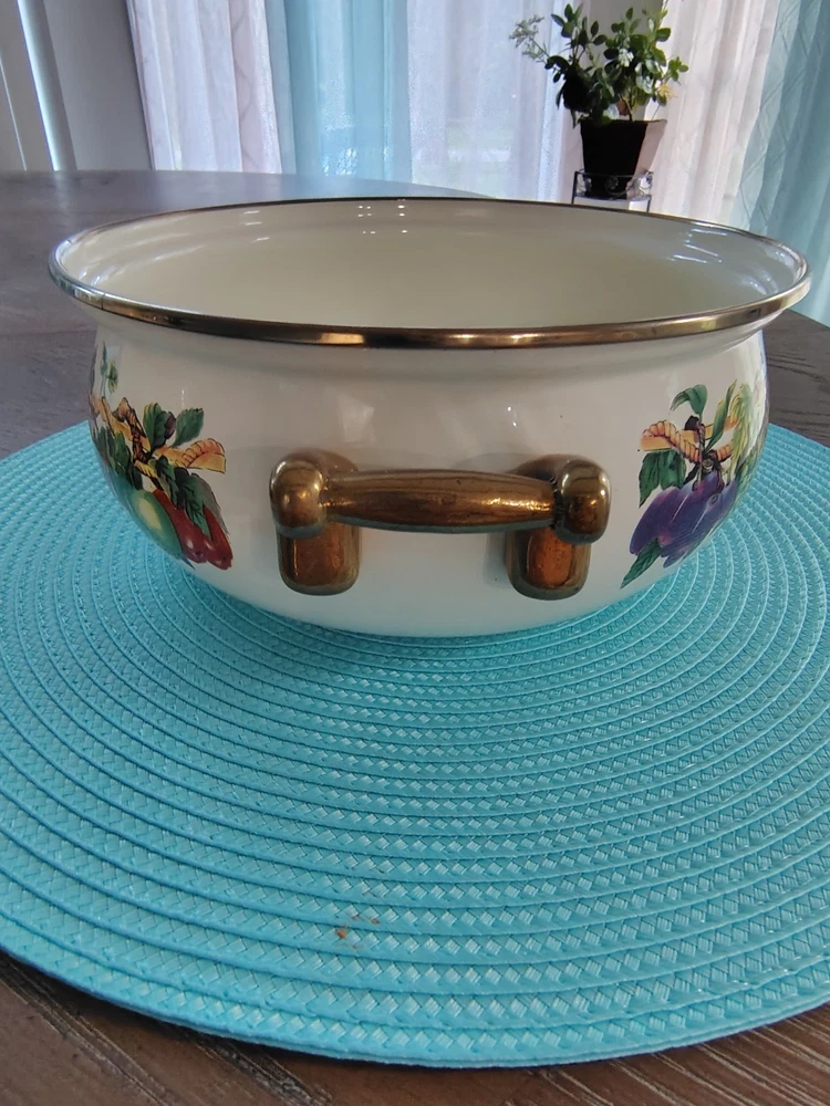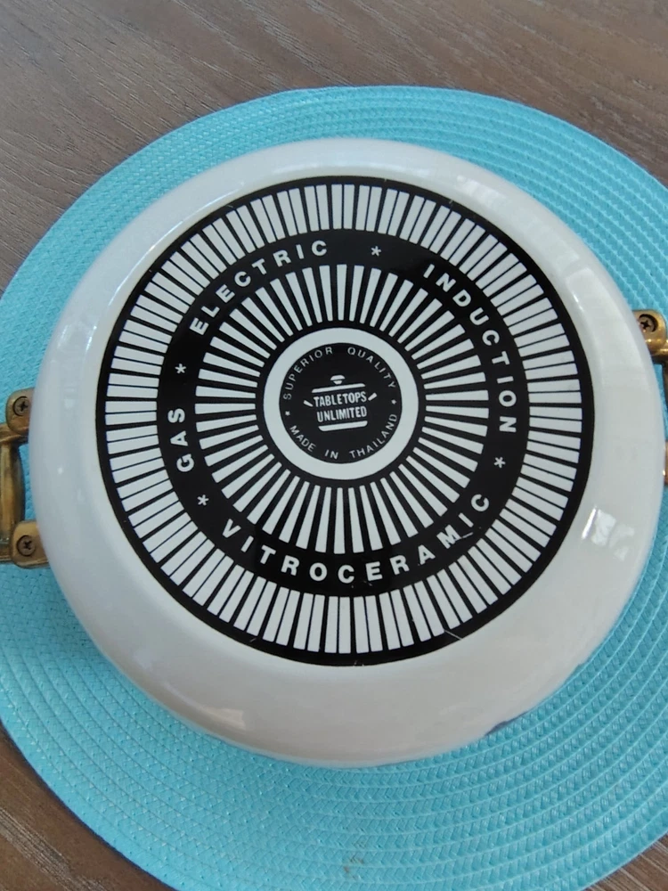 Stove Type Compatibility:Electric, Gas, InductionItem Height:4 inSet Includes:Lid, PotAntique:NoTime Period Manufactured:1980-1989Number of Items in Set:Two-PieceFeatures:Double Handle, Flat-Bottomed, With LidType of Oven:Electric, Gas, InductionSurface Coating:CeramicColor:MulticolorVintage:YesBrand:Tabletops UnlimitedShape:RoundCountry/Region of Manufacture:ThailandType:Dutch OvenMaterial:VitroceramicItem Diameter:9Original/Licensed Reproduction:Original
