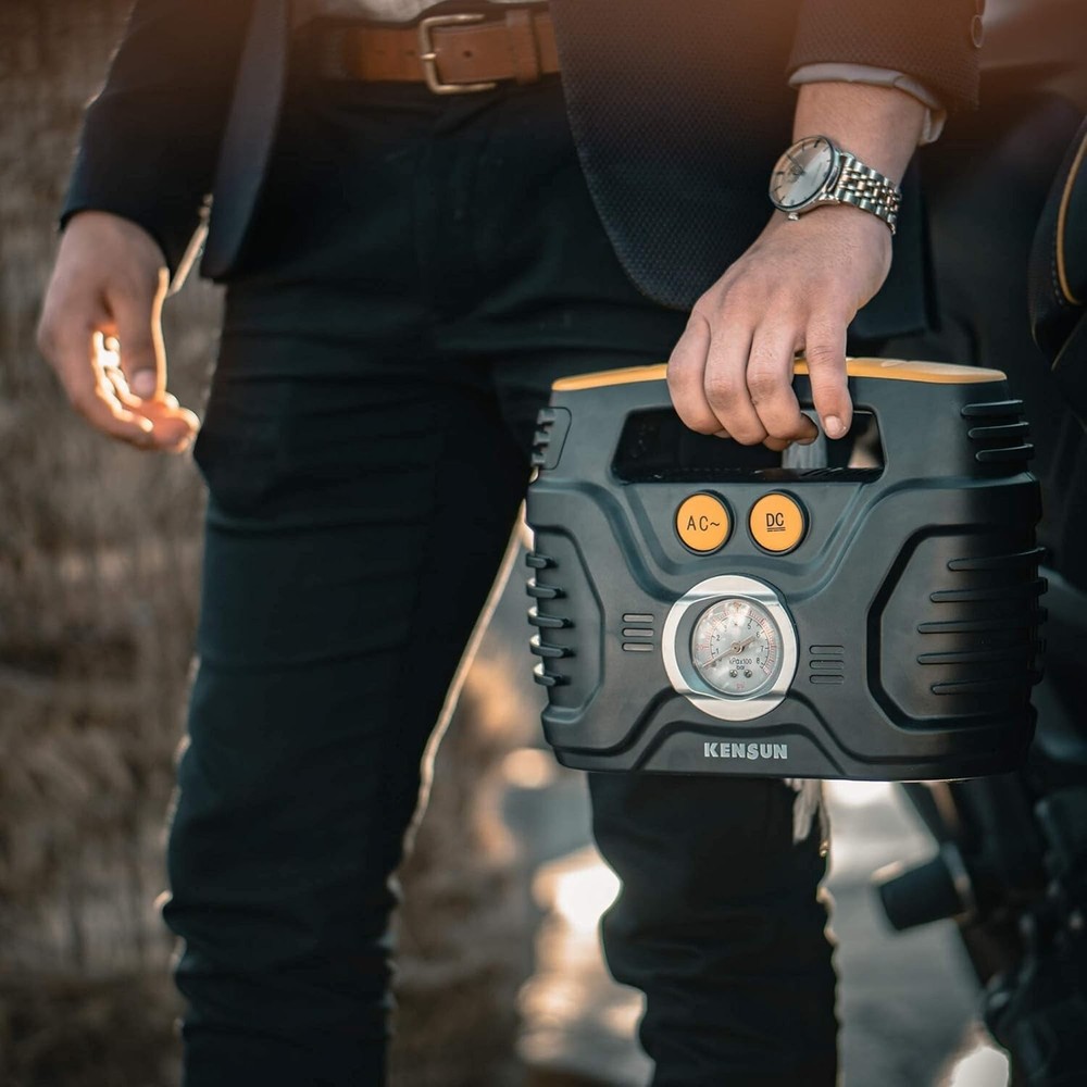 Kensun Portable Air Compressor Pump for Car 12V DC and Home 110V AC Swift Performance Tire Inflator 100 PSI for Car - Bicycle - Motorcycle - Basketball and Others with Analog Pressure Gauge (AC/DC) Fast inflation: Dual solid metal motors provide superb power, which will make your tire inflation super-fast and easy. AC/DC for car and home: Kensun’s unique AC/DC switching with 12V car cigarette light plug as well as 110V wall plug for home outlet makes this inflator more useful since you can use it anywhere. Easy to read: Large, bright, classic pressure gauge with unit conversion (PSI/Bar/KPA) that measures up to 100 PSI, giving you clarity at a glance. Multi-Purpose: Inflate tires of cars, bikes, sedan and midsize SUV. Adaptors for balls and inflatables included, in addition to the unique AC/DC capabilities makes this inflator useful in any situation. Built to last: When you buy a Kensun product you know that you are getting high quality, durable construction that has been tested rigorously.