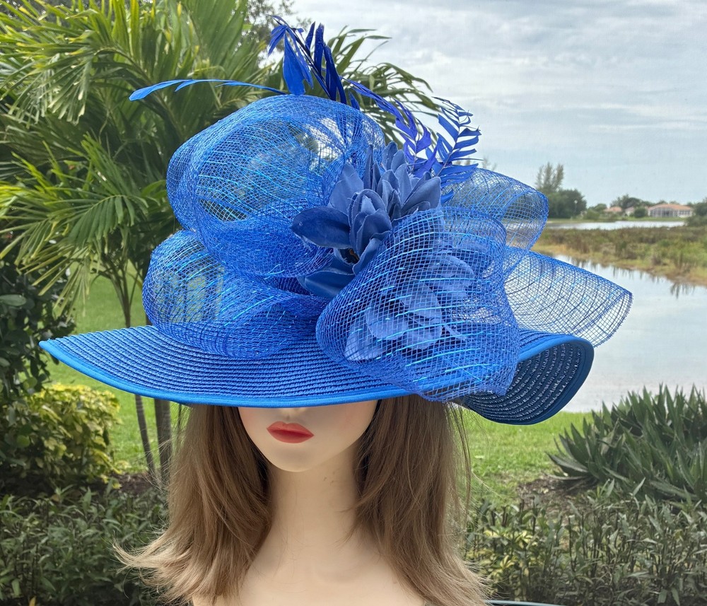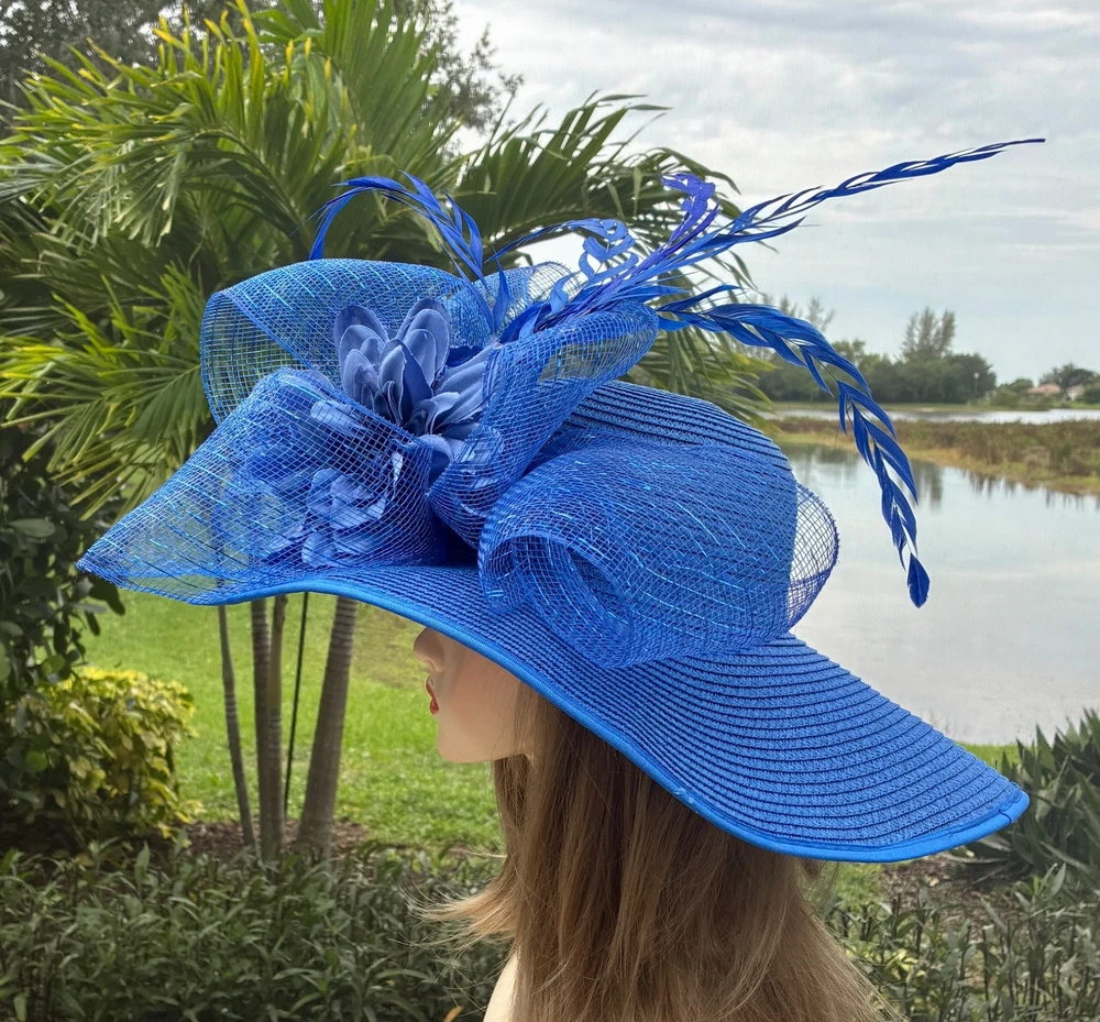 The Kentucky Derby Hat Church Tea Party Hat with Wide Brim is a stylish sun hat designed for women. The wide brim provides excellent sun protection while adding a touch of elegance to any outfit. The one-size-fits-all design in a classic blue color makes it a versatile accessory for any occasion, whether it's a derby party or a casual day out in the sun. Made with quality materials and attention to detail, this hat is perfect for those looking to make a fashionable statement while staying shaded from the rays.