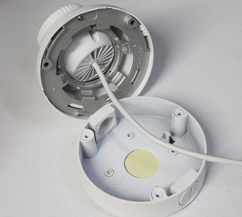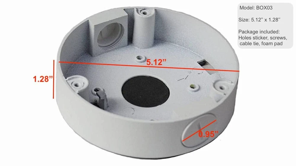 Compatible with all Hik OEM Turret cameras such as LaView, LTS, KT&C, Nuvico, Hunt, Winic and more: NV723MF-IR, NV724MF-IR, H48, CMHT1623W, CMHT1823xx, CMHT2722, CMHT2722-28, CMHT2722W, CMHT2732, CMHT2732-28, NC301-XD, NC303-XD, NC304-XD, CMIP3012XX, CMIP3022XX, CMIP3032XX, CMIP3042XX, CMIP1112XX, CMIP1122XX, CMIP1132XX, CMIP42XX, and more! Compatible with all Hik OEM Turret cameras such as LaView, LTS, KT&C, Nuvico, Hunt, Winic and more: NV723MF-IR, NV724MF-IR, H48, CMHT1623W, CMHT1823xx, CMHT2722, CMHT2722-28, CMHT2722W, CMHT2732, CMHT2732-28, NC301-XD, NC303-XD, NC304-XD, CMIP3012XX, CMIP3022XX, CMIP3032XX, CMIP3042XX, CMIP1112XX, CMIP1122XX, CMIP1132XX, CMIP42XX, and more! Compatible with all Hik Turret style cameras in the DS-2CD23 series: DS-2CD2342WD-I, DS-2CD2332-I, DS-2CD2312-I, DS-2CD2322WD-I, CMIP3042, CMIP1142, CMIP3022, DS-2CE56D5T-VFIT3, DS-2CE56D1T-VFIR3,DS-2CE56C2T-VFIR3, DS-2CE56D1T-IR3Z, DS-2CE56D5T-IR3Z Easily hide all connections within the base, and provides a better angle for viewing. Hole in the back to run cables in and out, and (2) 3/4" conduits on opposite sides of eachother. Please note that the 3/4" threads are SHALLOW - it may not fit all conduit fittings Material: Aluminium alloy ; Indoor / Outdoor Wall / Ceiling Mounting Base - Flush junction box for hik-Compatible Turret style Cameras Dimensions: 5.12'' x 1.28''