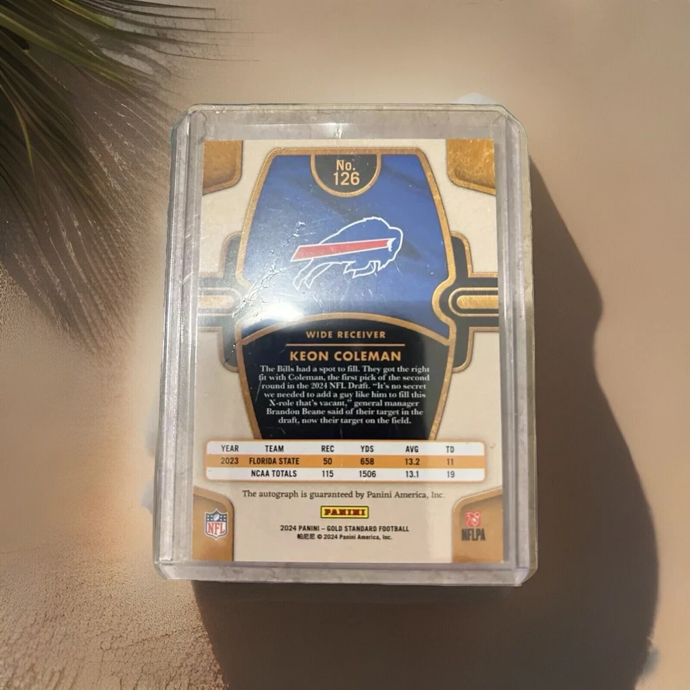 This is a rare and valuable Keon Coleman 2024 Panini Gold Standard football trading card. The card features an autographed rookie card of the Buffalo Bills player, with a limited edition of only 199 cards. The card is well-preserved and is in excellent shape, maintaining its original quality since its manufacture. This trading card is a great addition to any sports memorabilia collection, especially for fans of the National Football League (NFL). The card is properly graded and comes with a certificate of authenticity to ensure its authenticity. Don't miss out on the opportunity to own this unique piece of sports history.