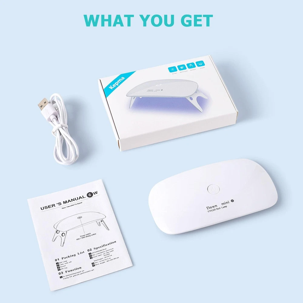 Kepma UV LED Nail Dryer Mini lamp Portable Curing Light for Gel Nail Polish,6w(White) Product Details Finish Type: Polished Base Material: Resin Bulb Base: Prong Product Dimensions: 3.54"D x 5.12"W x 0.79"H Item Weight: 0.11 Pounds Is Discontinued By Manufacturer : No Product Dimensions : 5.12 x 3.54 x 0.79 inches; 1.76 ounces Date First Available : January 10, 2019 Manufacturer : Kepma Customer Reviews: 3.9 3.9 out of 5 stars 16,469 ratings Finish Type: Polished Base Material: Resin Bulb Base: Prong Product Dimensions: 3.54"D x 5.12"W x 0.79"H Item Weight: 0.11 Pounds Lamp Type: Nail Dryer Shade Color: White Shade Material: Resin Switch Type: Touch Style: Minimalist Brand: Kepma Color: White Special Feature: Rechargeable Light Source Type: LED Material: Resin Room Type: Office Recommended Uses For Product: Curing Power Source: Corded Electric Number of Light Sources: 6 Connectivity Technology: USB Included Components: Power Cable Is Waterproof: TRUE Bulb Shape Size: A19 Mounting Type: Tabletop Wattage: 6 watts Number of Items: 1 Lighting Method: LED Control Method: Touch Indoor/Outdoor Usage: Indoor Water Resistance Level: Waterproof Installation Type: Nail On Number of Pieces: 1 Efficiency: High Efficiency Voltage: 5 Volts (DC) Is Cordless?: No UPC: 886319224517 686494436961 686494436862 Size: 3 Piece Set Manufacturer: Kepma Shade Height: 0.79 Inches Part Number: UVL Item Weight: 1.76 ounces Is Discontinued By Manufacturer: No Finish types: Polished Special Features: Rechargeable Batteries Included?: No Batteries Required?: No Wattage: 5 Watts Date First Available: January 10, 2019 1.Attention Please: The lamp works well with GEL nails but not for TRADITIONAL nail polish Dual light sources (wavelength 365nm+405nm), makes it works fastly with gel nail polish(top coat/base coat/color gel),gel stickers and uv resin,but not for traditional nail polish. The traditional nail polish needs to be air dried rather than curing by uv nail lamp. 2.Mini Size Mini size(3.54"D x 5.12"W x 0.79"H), 0.11 lb light weight, can be easy to put in your makeup bag, handbag even in a wallet. 3.Timer Design: 3 Timer Settings : 60s, 180s and "Stay on" .Press ON/OFF button once for curing 60 seconds, second press for 180 seconds.Press and Hold for 3-4 seconds, it stays on. Warm Tips: The nail lamp is not rechargeable. When using the product, please connect the attached cable to a mobile powerbank or the other USB socket. 4.Pretect Your Eyes adn Skin Comparing with other products, its light is closer to white light, has no harm to eyes and skin. Fashionable and durable 50000hrs lifetime, ideal for personal use and best gift for friends. 5.Warranty100% customer satisfaction is our pursuit, we can provide 12 months warranty.Warm Tips:Please notice the lamp size before placing an order . It is normal for gel nail polish to feel sticky after curing.DO NOT WIPE. It is recommended to apply as thin a coat as possible when applying gel nail polish. The curing time will be shorter.