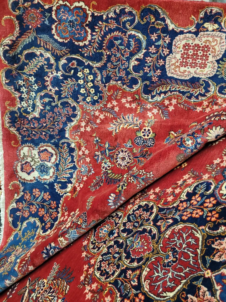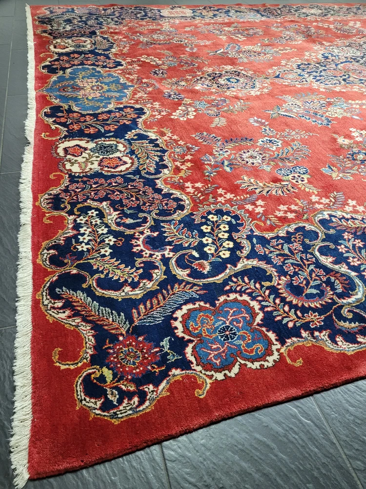 Herzlich willkommen, angeboten wird ein prachtvoller Keschan Teppich aus feinster Korkwolle, handgeknüpft in meisterlicher Qualität. Das leuchtend rote Mittelfeld ist mit einem zentralen, reich ornamentierten Medaillon geschmückt, umrahmt von geschwungenen Blütenranken, Palmetten und kunstvoll gestalteten Arabesken. Eine tiefblaue Hauptbordüre mit floralem Wechselmotiv fasst das Gesamtbild elegant ein – ein Klassiker der persischen Knüpfkunst in eindrucksvoller Größe. Artikelnummer: GJH25/235 Maße: 415 × 320 cm Gewicht: ca. 43 kg Details: Material: Korkwolle, handgeknüpft Knüpfung: fein, dicht und präzise gearbeitet Farben: Rot, Dunkelblau, Hellblau, Beige, Grün, Goldgelb, Akzente in Rosa Design: zentrales Medaillon auf rotem Grundfeld, florale Muster mit reicher Bordüre Florhöhe: mittelhoch, weich und gleichmäßig geschoren Rückseite: saubere, feste Knüpfstruktur, hohe handwerkliche Präzision Zustand: Sehr guter, gepflegter Zustand mit kräftigen Farben und gleichmäßigem Flor. Die Bilder sind Teil der Zustandsbeschreibung. Versand: Versicherter Versand weltweit per DHL, UPS oder GLS.