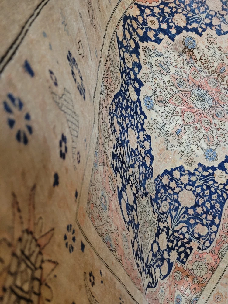 Herzlich willkommen, angeboten wird ein seltener, fein gearbeiteter Keschan Teppich mit klassischem Zentralmedaillon und floralem Dekor. Dieses handgeknüpfte Meisterstück überzeugt durch seine harmonische Farbgebung, detailreiche Knüpfkunst und elegante Ausstrahlung – ein beeindruckendes Beispiel traditioneller Teppichkunst. Artikelnummer: GJH25/299 Maße: 190 × 132 cm Details: Material: Korkwolle auf Baumwolle, handgeknüpft Knüpfung: fein und präzise, dichte Struktur Farben: Nachtblau, Rosé, Beige, Himmelblau, Altgold Design: Zentralmedaillon mit symmetrischem Aufbau Florale Ranken und Palmetten im Fond Bordüre mit kunstvoll verschlungenen Blütenmustern Harmonischer Farbverlauf mit feinen Schattierungen Verarbeitung: Hervorragende Handarbeit mit ausgewogener Balance zwischen Ornamentik und Farbe. Der Teppich zeigt typische Merkmale älterer Keschan-Knüpfkunst: zarte Linienführung, klare Medaillonform und florale Eleganz. Zustand: Guter, gepflegter Erhaltungszustand mit authentischer Patina. Leichte Gebrauchsspuren, altersgemäß schön erhalten. Die Fotos sind Bestandteil der Zustandsbeschreibung. Versand: Versicherter weltweiter Versand mit DHL, UPS oder GLS.